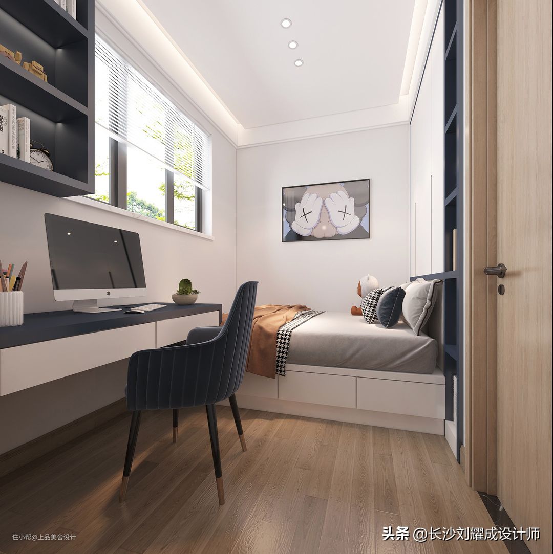儿童房采用了原木、蓝、灰作为主色调,清新自然,墙面挂上插画错落有致,让孩子享受自由自在的家居环境