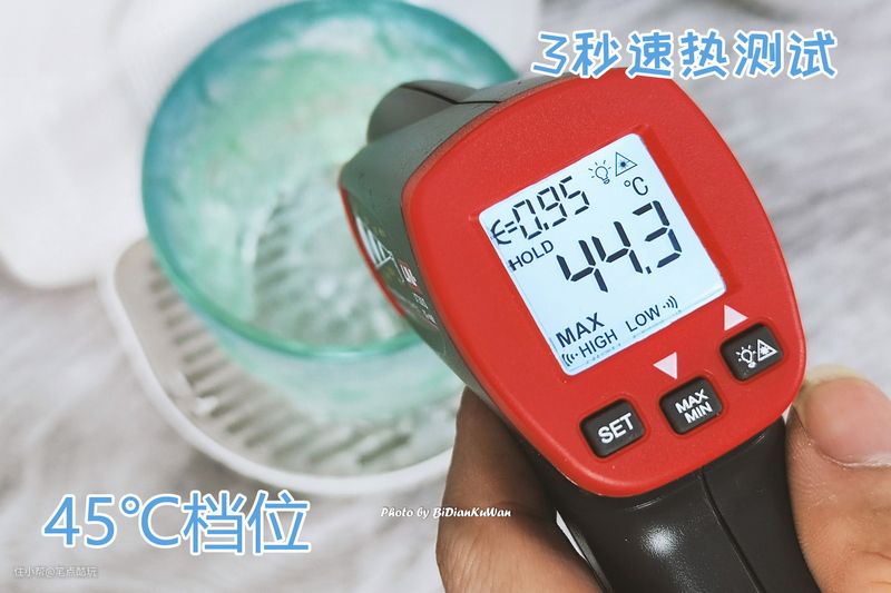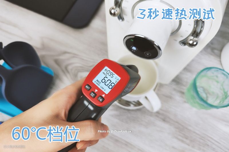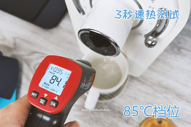 我手头没有测水温的水银温度计,只有一个测温枪,但这种非接触式的红外测温仪在测试水温时可能会受到杯子材质(比如玻璃杯增加反射)的影响,测试出水温度也可能会受到杯子本身温度的中和影响,所以这个测温数据仅作为参考,我的期望值是大致对得上对应档位就可以给个合格分。