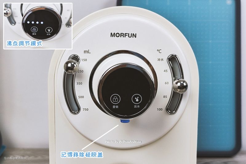 下面重点说说它的操控方式,内黑外白两个圆,勾勒出魔凡操控面板的简洁美感。外环左右各1个机械拨扭,看上去有一丝复古感,但内圈触屏又把人拉回智能派,告诉你“手指点点”就能坐享其成。魔凡这款冷热饮水机还支持高原沸点调节,通电开机10秒内按住“出水”键,看到中央出现4个圆点时即可接下来操作。