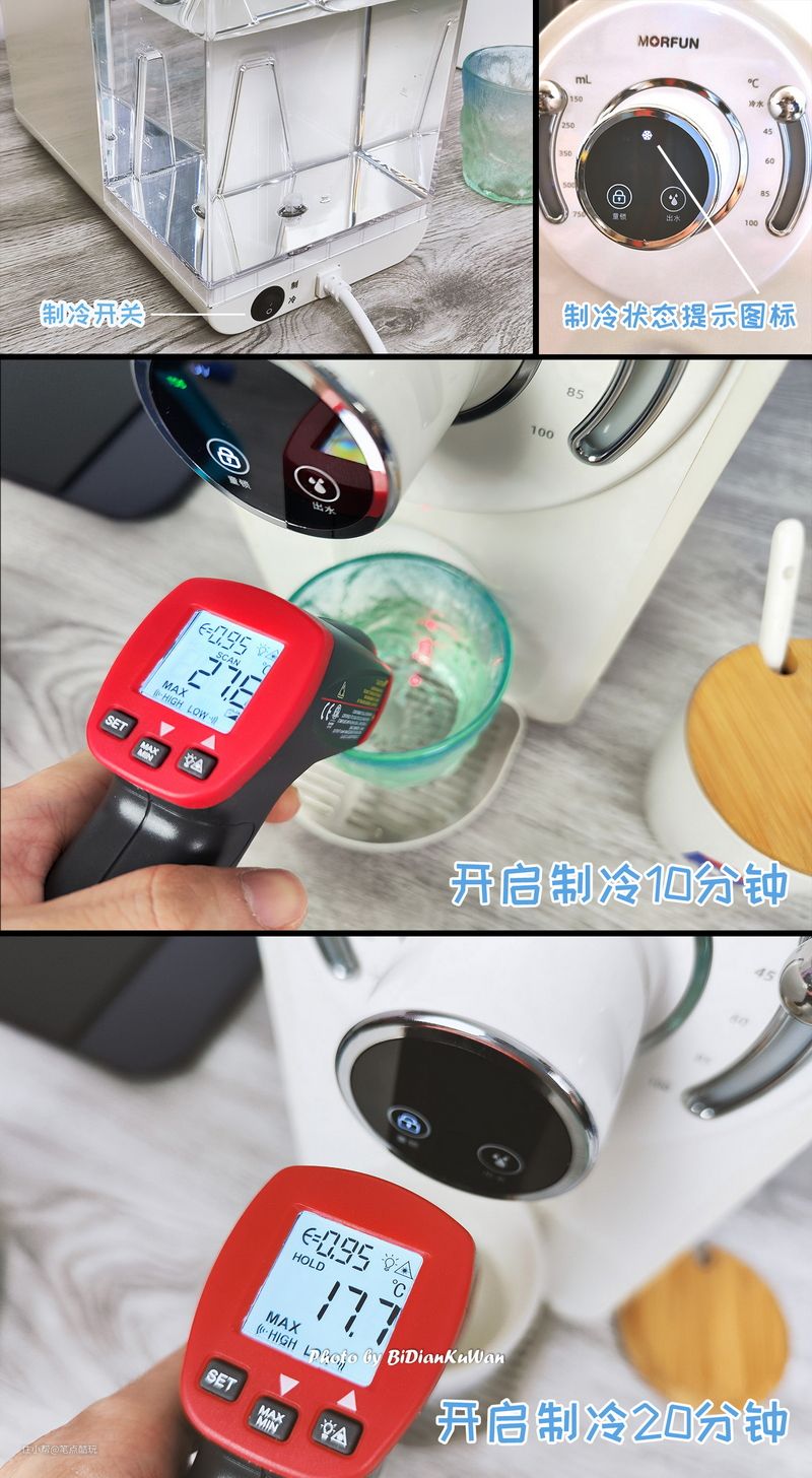 制冷的过程比不了烧热水,魔凡可以凭借0.4升的冰胆,在20分钟内制出10至15℃的冰凉之水,不过我在制冰水的过程中就取了几次冰水测温,从上图可以看到,10分钟测出来,常温时测得34度的已经降到27.8度,20分钟时这个温度降到17.7摄氏度。制冷水效果已经很令人满意了。