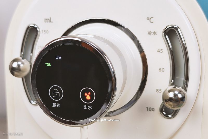 它的温度档支持冷水、45、60、85、100摄氏度水温,以及常温出水6个档位,出水量支持150、250、350、500、750ml共5个档位,出水冷热和多少都可以快捷调整。下图是我把温度拨扭打到85℃,水量打到350ml档位,一键出热水的定格。可以看到屏幕上有UV(紫外线杀菌处理)、TDS(水质检测)图标亮起;出热水时,出水灯是红色的,如果换成冷水,灯色会变成绿色。