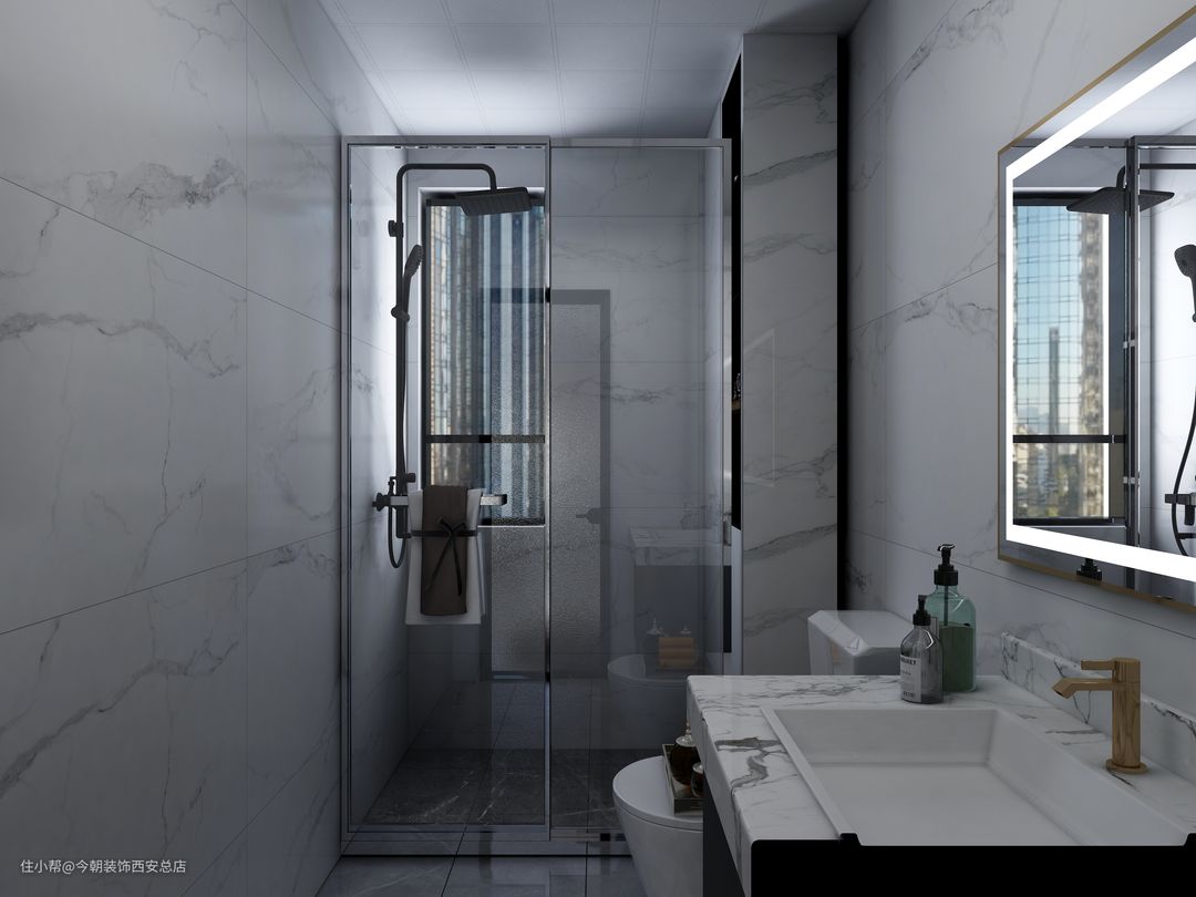 灰白色调的卫浴空间,保持着素雅的视觉观感,黄铜的元素延续了整体空间的复古轻奢格调。