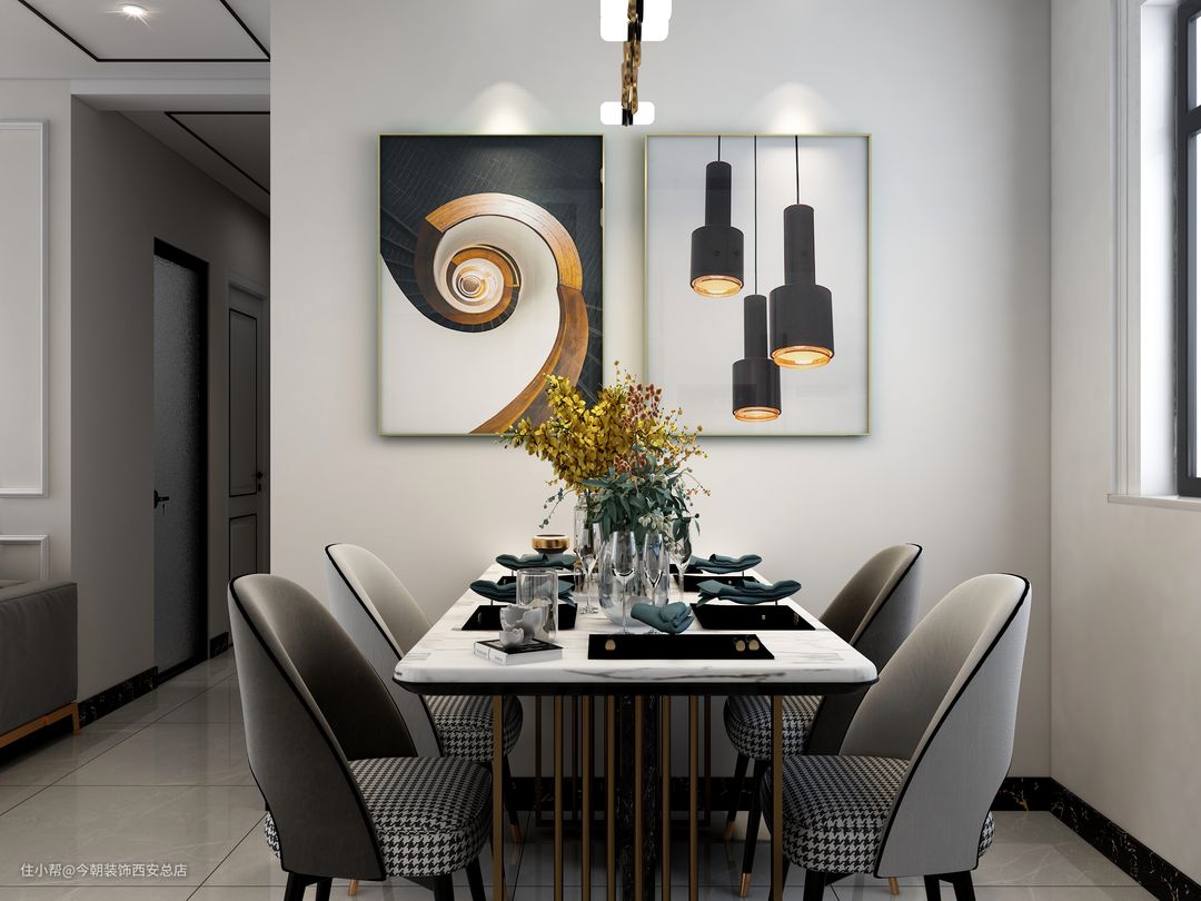 精致的生活离不开餐厅的调味与补充,而与客厅的开敞互联则传达出微妙的视觉张力。两端背景墙,在不同材质与积木几何的搭配组合中,传递着平衡互补的哲学之意。个性独特的灯饰与桌面盆栽,迸发一种自然和谐之美。