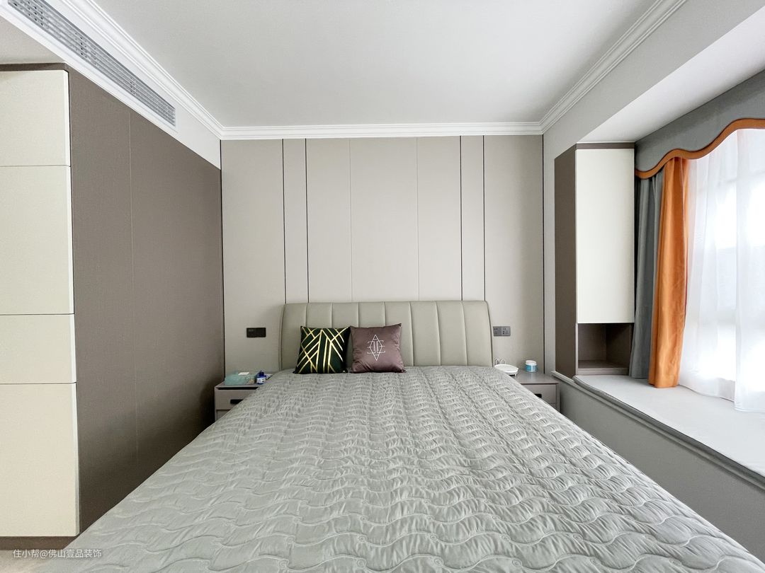 1.色调:作为主要的休憩空间,不建议大面积的过于鲜艳的色调,因为这类型的色调会让人处于比较亢奋的状态,不容易入眠,小面积的使用可以提亮空间,不会显得过于单调。床头背景墙采用了伦敦雾的护墙板,其他墙面粉刷稍浅的灰色调,营造了一个静谧的空间,窗帘拼接小面积的爱马仕橙色,白色的石膏线走边凸显空间的层次感。
