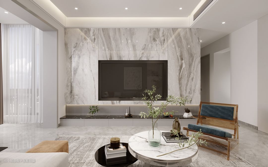 客厅电视面做内嵌,与墙面组合,一整面形成一个整体,造型简洁,轻松明快,简约又不失单调。有一种恰到好处的留白。亚克力才知道椅子给整个空间增加了一抹亮色和视觉印象。#大理石背景墙#无主灯设计#室内设计