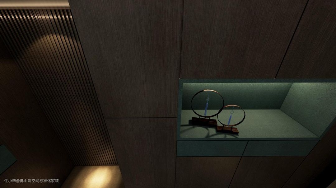 玄关柜是深色木纹的高级质感,柜体中部挖空,安装挂勾,用来挂放钥匙 帽子、包包等物品,拿取方便。柜体木格栅部分内嵌作为多功能区域,不仅可以用来挂放屋主日用包,日常出门换鞋还可以充当坐凳。转角做矮柜,墙上悬挂山水画,体现新中式风格。