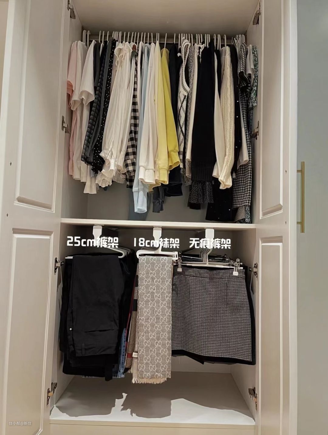 在衣柜的层板上,加几根滑轨裤架,利用进-出抽拉的方式收纳裤子,不仅直观、拿取不用翻找。