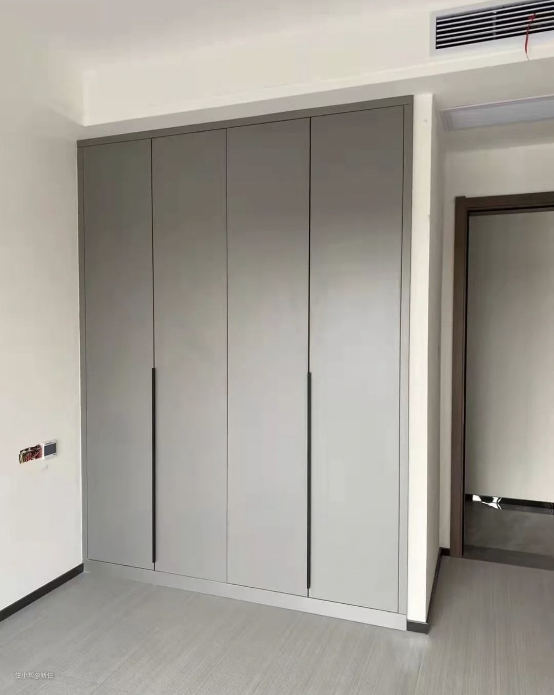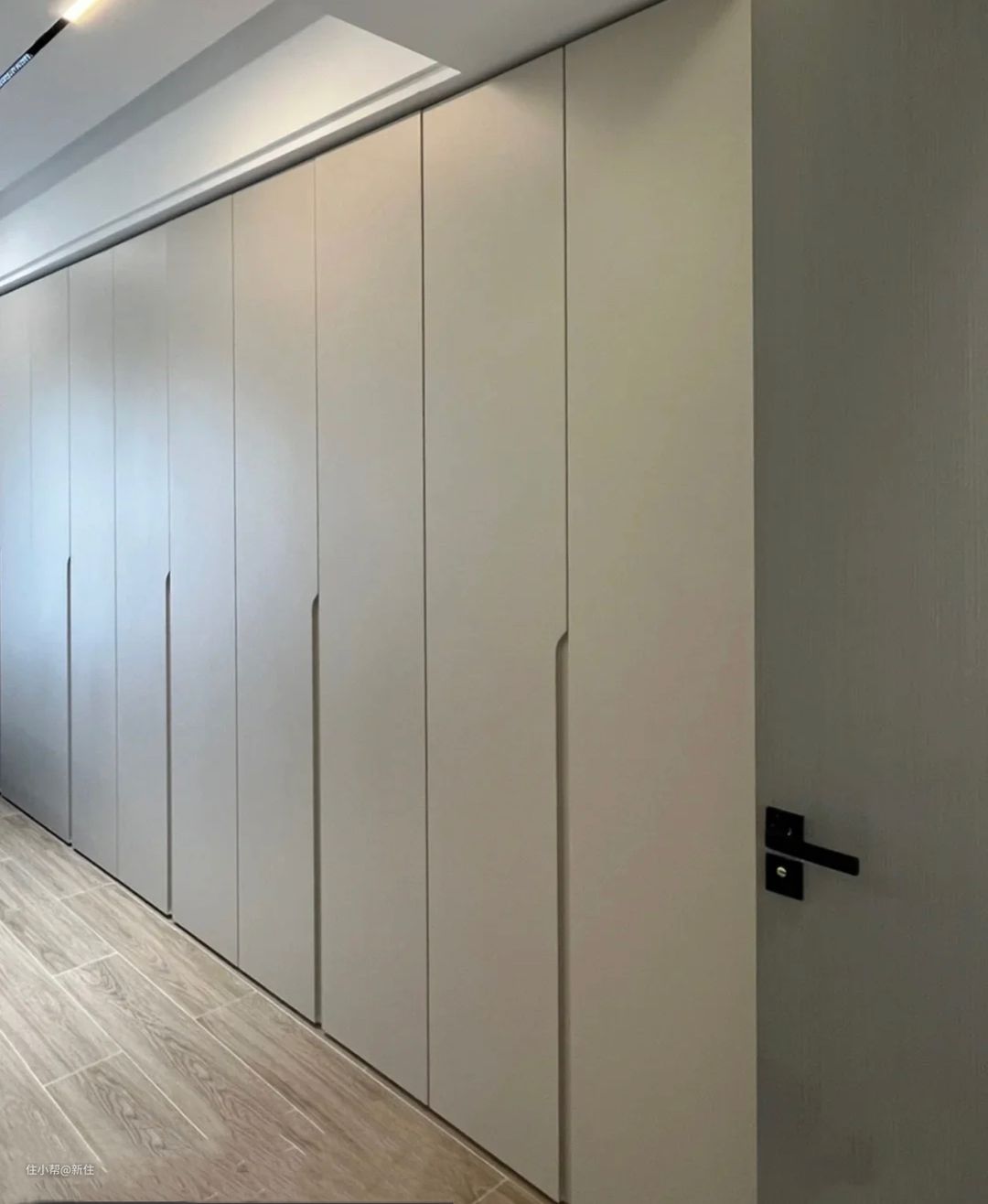 小编建议,大可不必费尽周折地将衣柜再砌墙做成嵌入式的,衣柜的一周,用于柜门接近颜色的见光板,美观还简单。