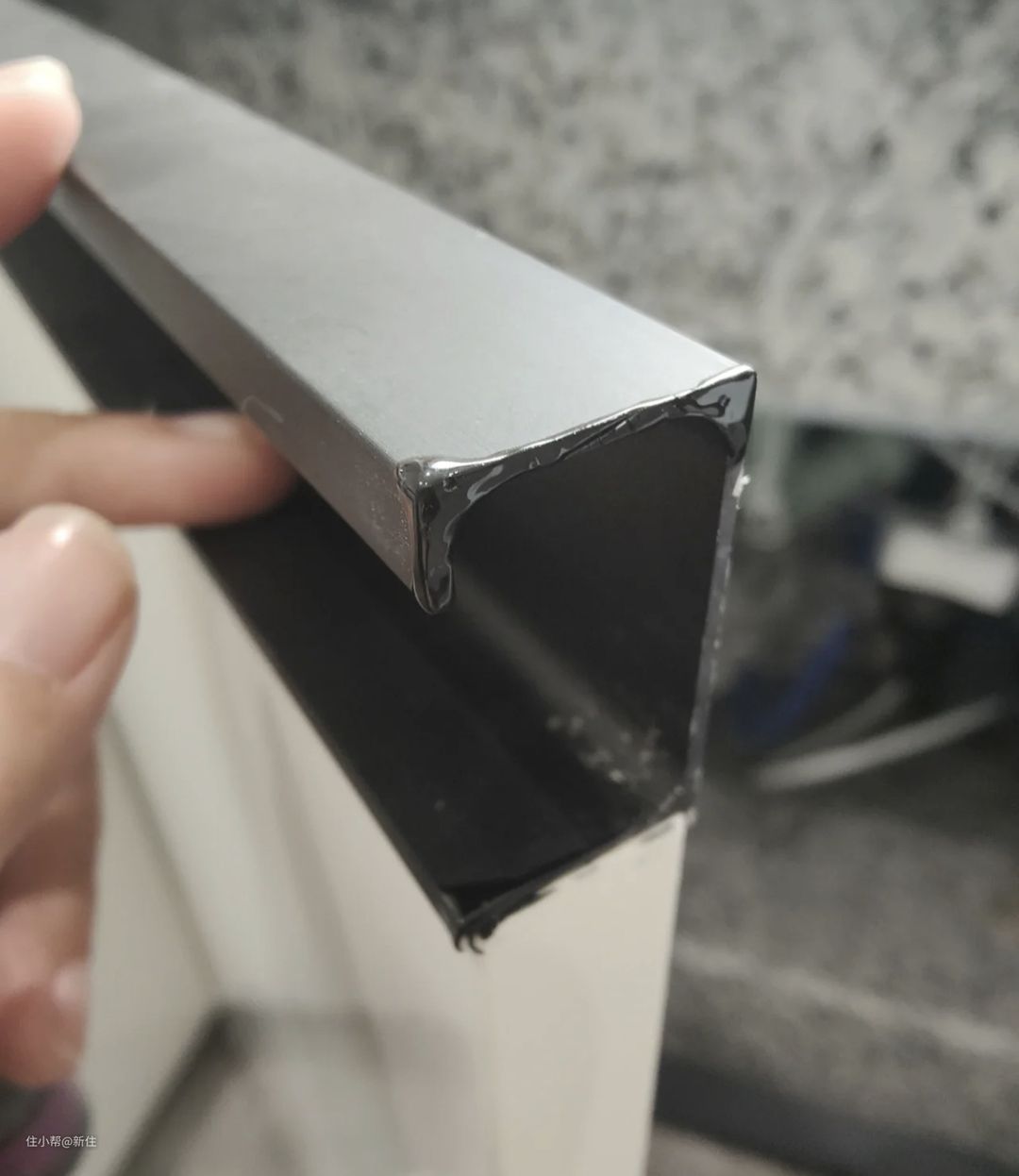 广泛用于厨房台面的石英石,因为本身硬度的关系,不能直接切成圆弧状,而是要通过拼接-打磨成圆弧状,这也正是很多人家的圆弧挡水条,用一段时间就会发现有一条黑线的缘故。