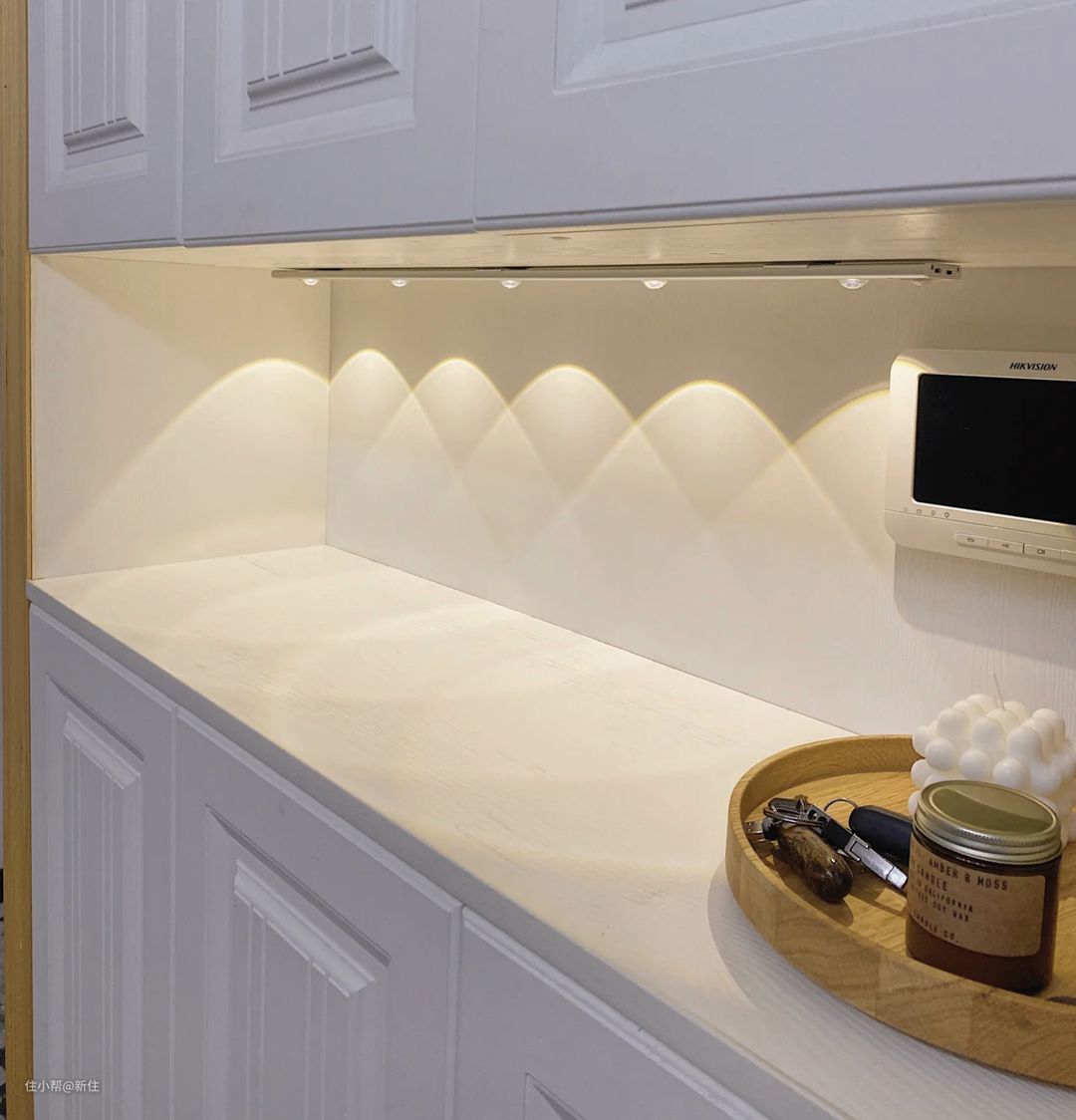 其实,大可不必那么麻烦,现在市面上就有了简单安装的灯带,后面是靠磁吸片固定在柜子上的,灯光还是类似射灯的猫眼效果。
