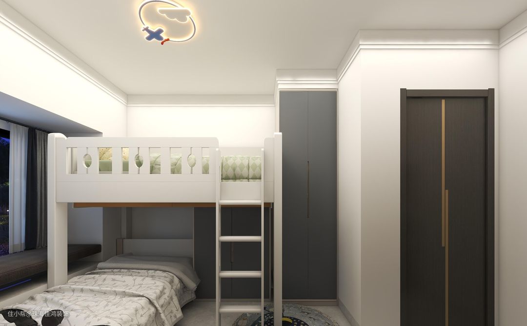 2、减少了一个卫生间,把原来的次卫纳入了次卧,这样的话次卧整体空间变大,收纳空间也增加了不少,定制交叉上下铺,更合理的利用空间。