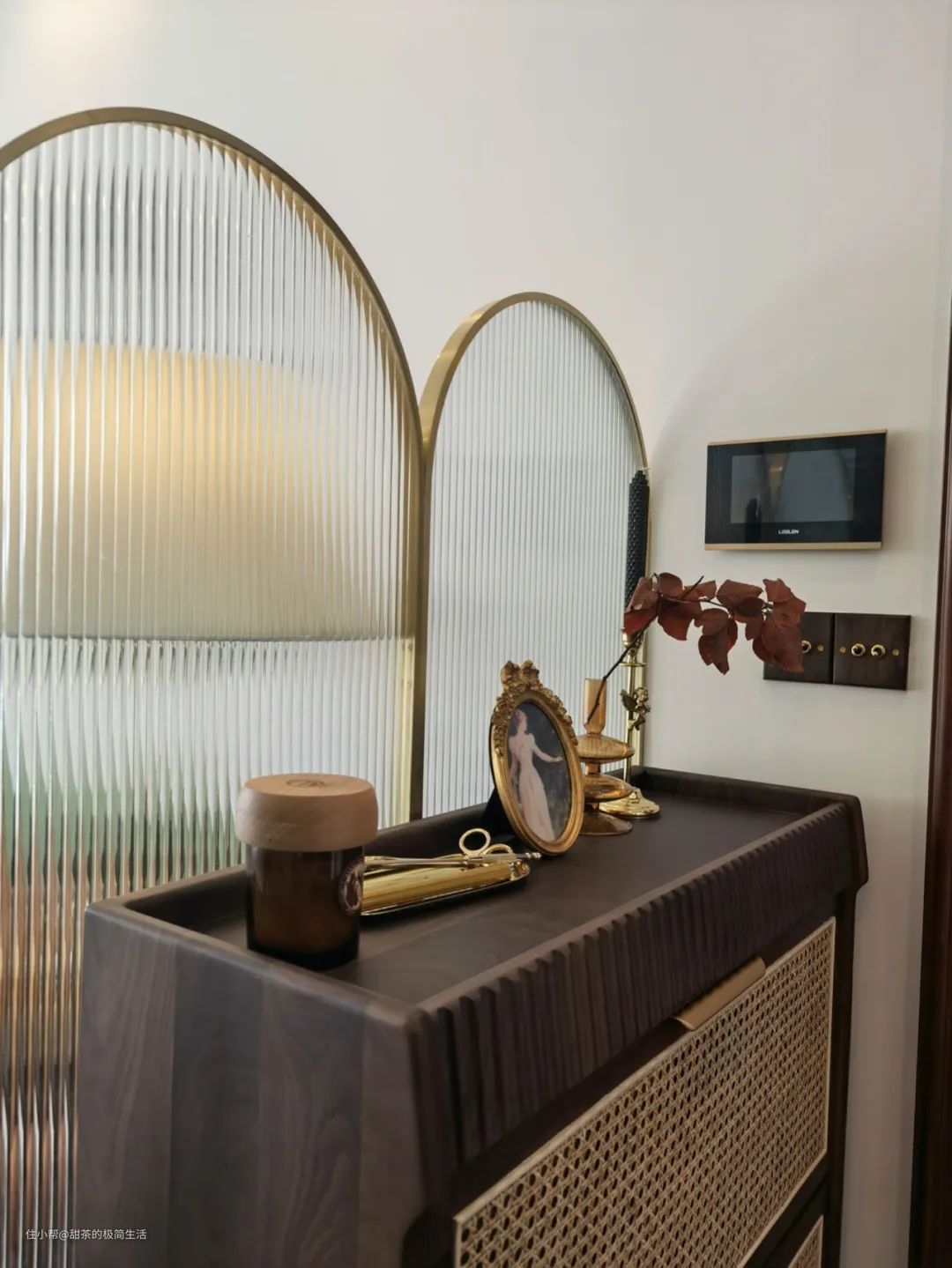 入户玄关和客厅之间,设置了长虹玻璃屏风,以拱形金属条收边,效果简约通透,可以遮挡一部分入户视线,营造出朦胧的美感。