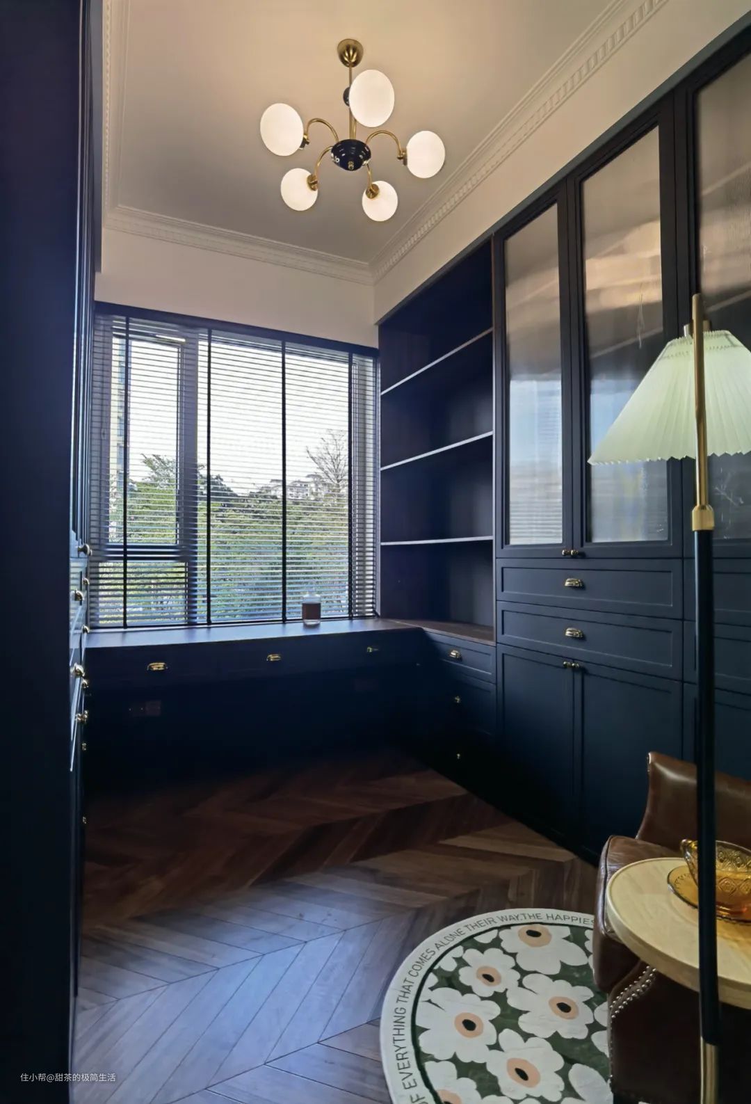 书房采用了深蓝色的定制柜体,从窗户向两侧发散,柜子和书桌形成U型布局。