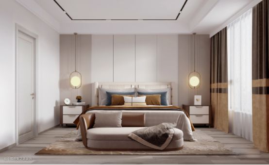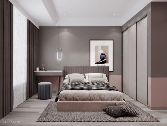次卧空间宽阔,极具时尚艺术的壁画+落地窗增加空间的通透性,延伸视角。吊灯的孔灯和床头的弧圆吊灯小巧精致,到顶衣柜使内部空间和多功能储物区域,满足居住者的不同收纳需求。