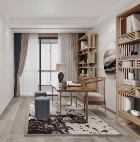 书房的布局更具有国风,采用实木元素,让整个空间更加自然,而浅色原木和圆形山水画进互相搭配,再配上半透明的落地窗以及太师椅的相互融合,书房空间有一定的私密性,以及书柜定制,更具有多样性,有一丝复古性。