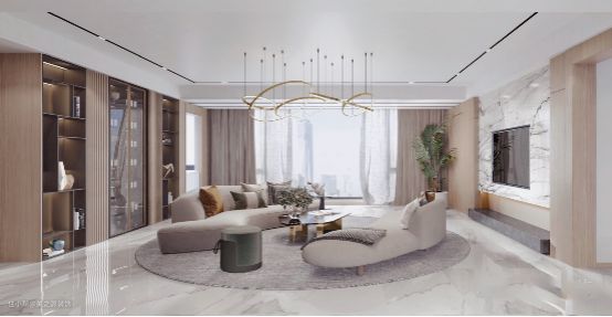 设计师在客厅中选用具有弧线勾勒出的沙发,整体空间淡雅、时尚、浪漫,看起来比较有活力,再加上大面积的落地窗,在空间上变得更加通透以及若隐若现的白色窗纱搭配绿植盆栽,让空间更具鲜活力,具有弧度的圆形吊灯,透露出空间的精致感。