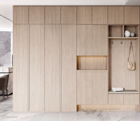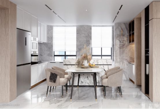 餐厅并没有过多复杂的装饰,反而是极简的白色来渲染空间的整体基调,大理石岛台搭配桌桌椅+嵌入式的双开门大冰箱,让空间最大利用化,原木橱柜·的设计,透露出空间的朴素性。