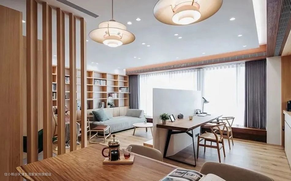 把客厅布置成学习中心,沙发墙或者电视墙布置成书架,客厅中间可以放一个书桌,日常家庭活动就可以围绕学习开展。