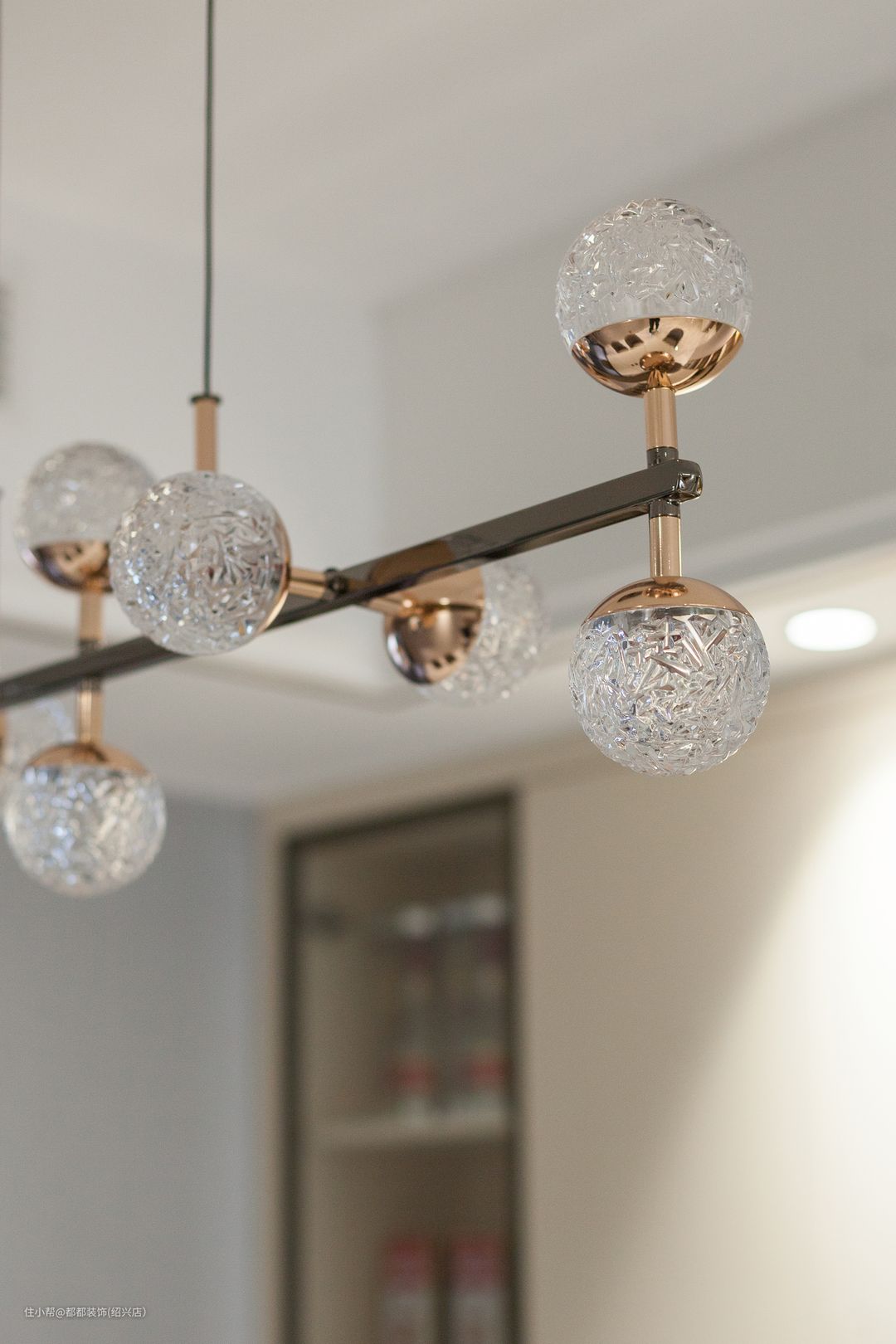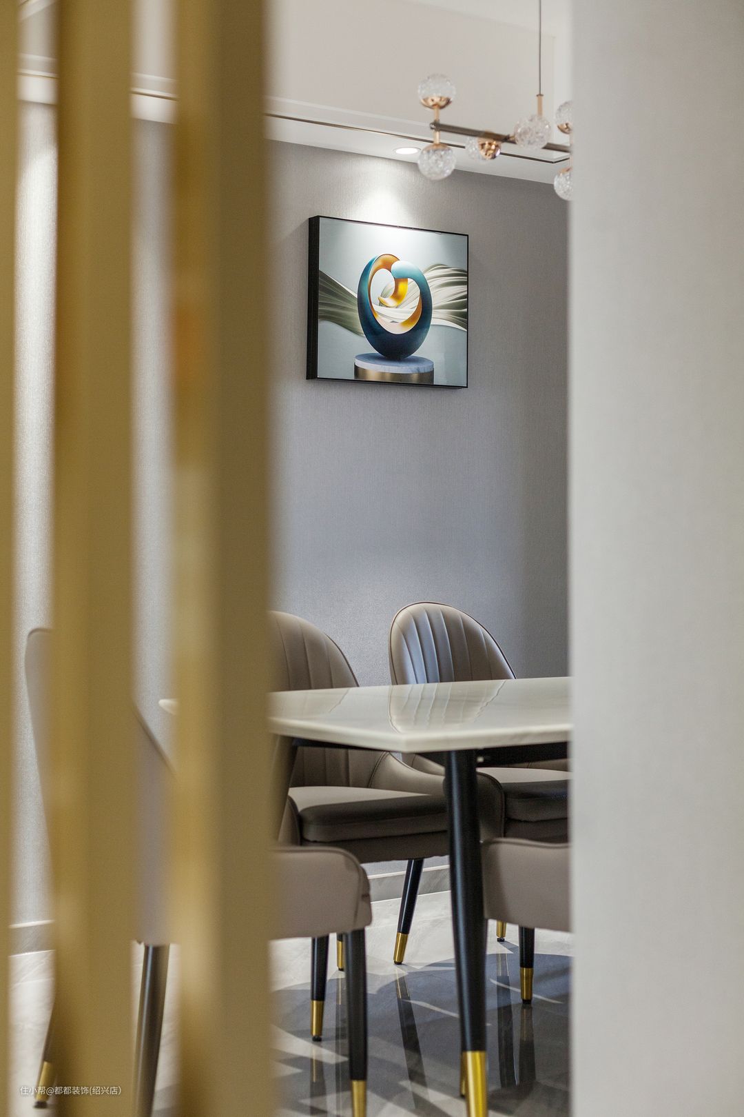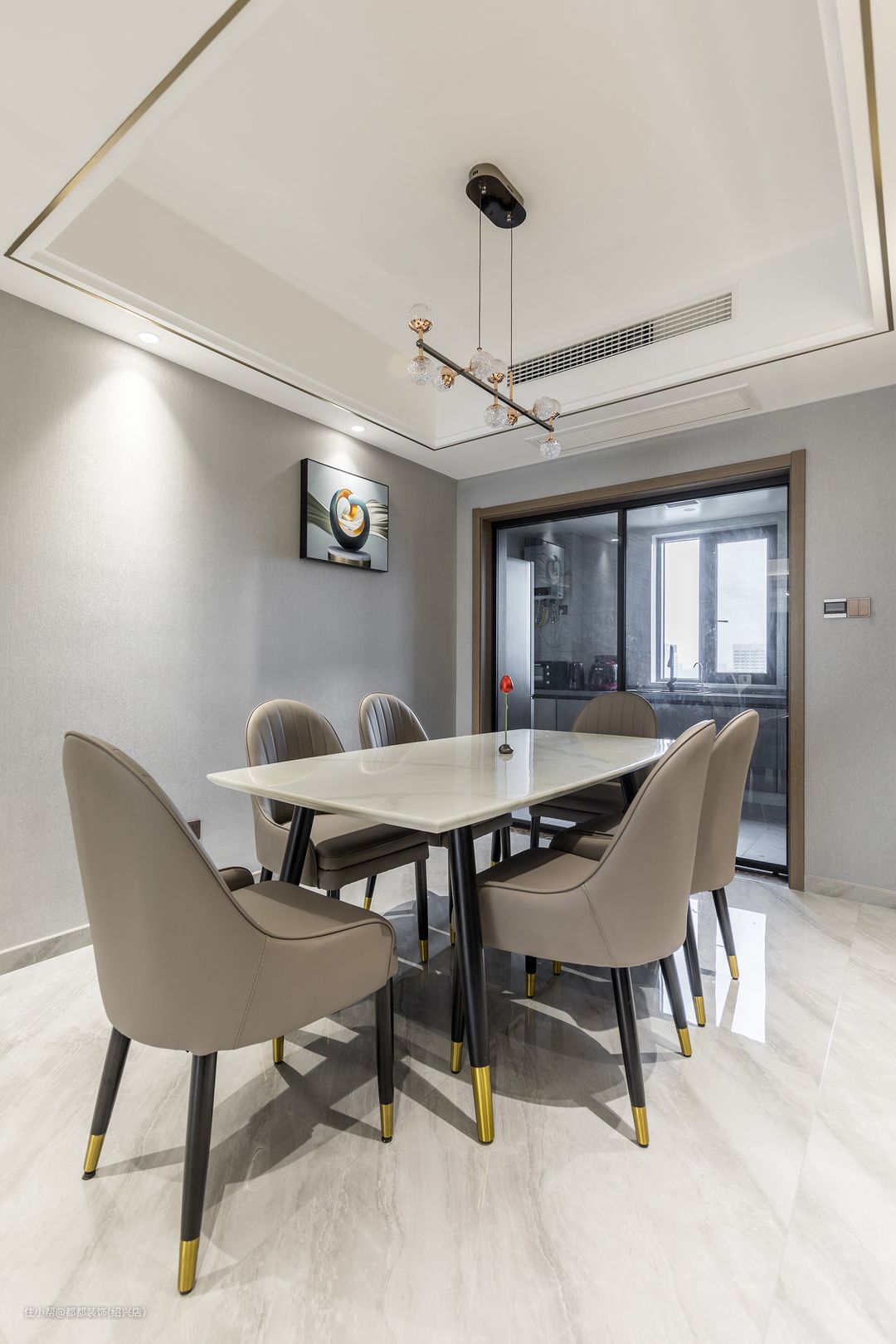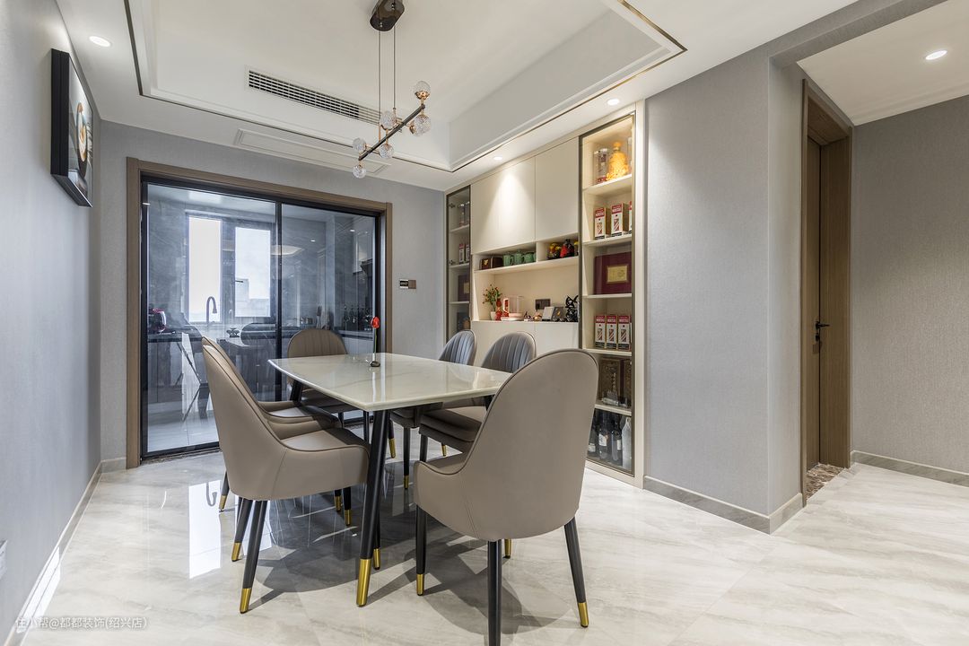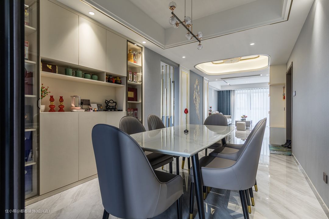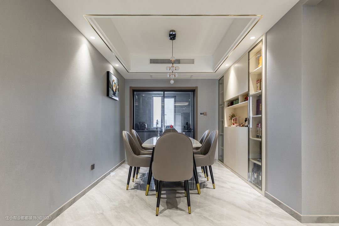 餐厅集收纳、颜值、设计感于一体,将空间高级感拉满的都都装饰(绍兴店)2022-08-12餐厅一面墙仅仅挂了一副装饰画,而另一边则是整面橱柜设计,米白色柜体与背景墙相融合,集收纳、颜值、设计感于一体,将空间高级感拉满,简约了空间形态又收纳了零碎物品。