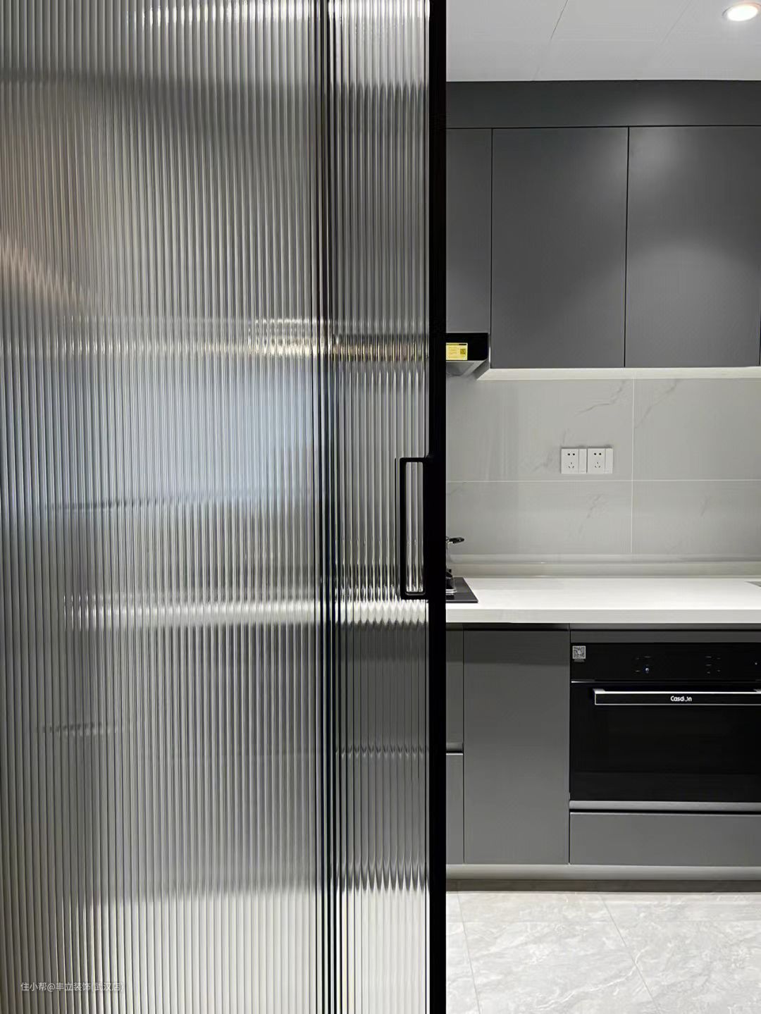 厨房以长虹玻璃门做推拉隔断,和餐厅相隔,既不影响采光,又能隔离油烟。