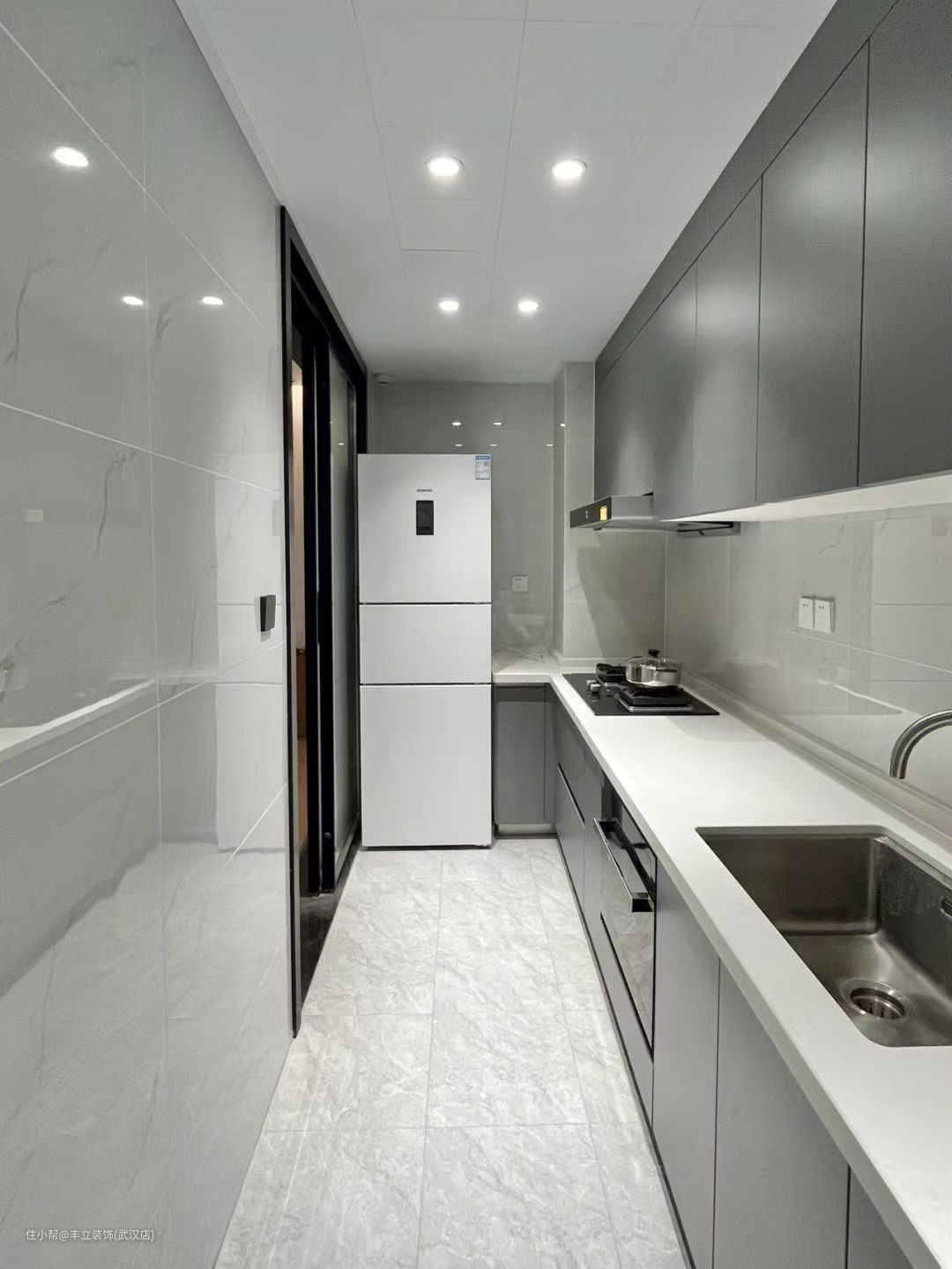 另一侧靠墙放置冰箱,虽然是I字型的台面设计,合理规划,操作动线依旧流畅,做饭更加省时省力。