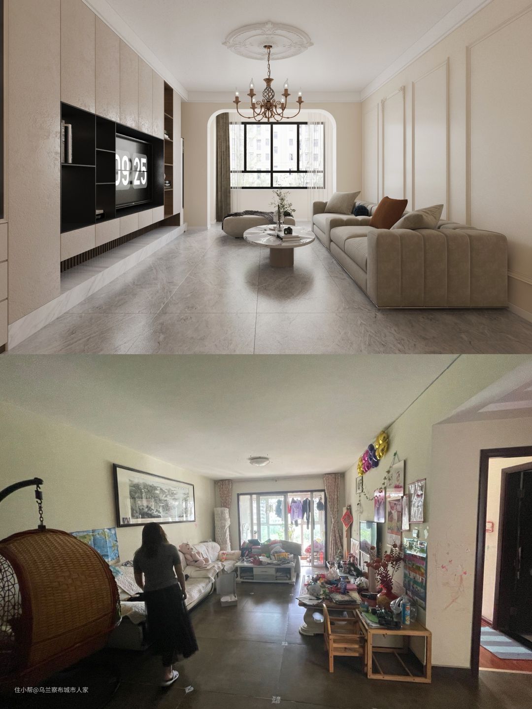 从旧房中可以看到,沙发、家具都已经陈旧,由于缺少收纳空间,整体陈设非常凌乱。改造后,以浅灰色地砖搭配奶油色墙面,定制多功能电视背景墙,整个通透明亮,带来温馨优雅的生活空间。