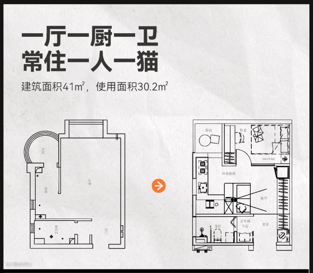 原本只有一间卧室的45㎡小屋,从客厅隔出了一张床的面积。