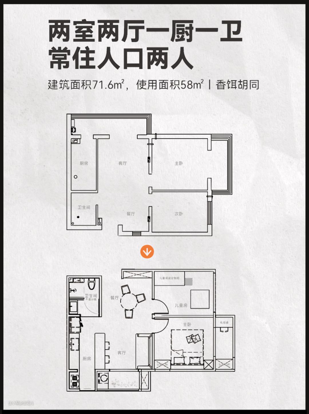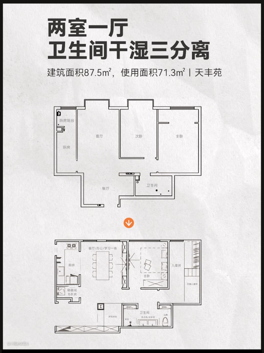 八零筑二是北京非常典型的80年代户型,长条状、中间采光差,两室一厅、公共空间狭小。
