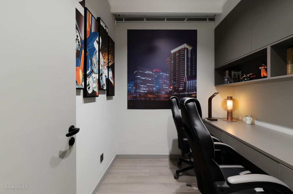 男主人最爱的是次卧改造的电竞房,并排而放的两台电脑满足了两人日常开黑,以及女主人在家工作的需求。