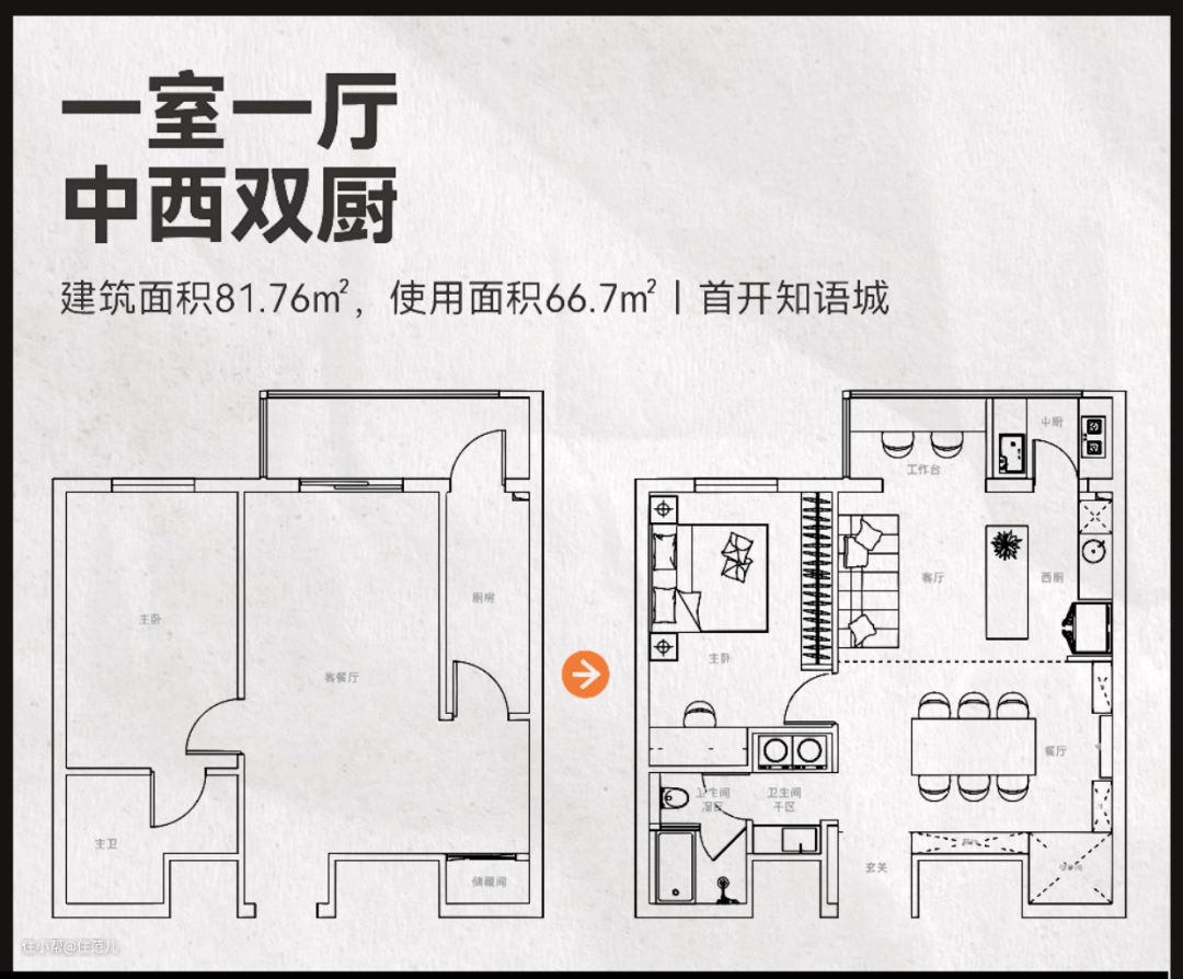 没有电视及电视墙,释放出了西厨,加上岛台形成了洄游动线。