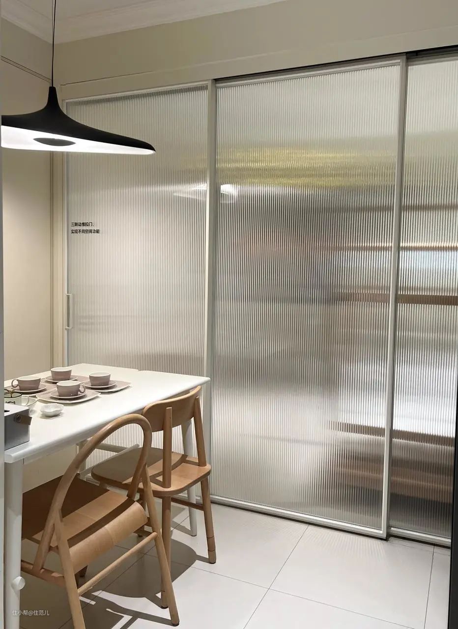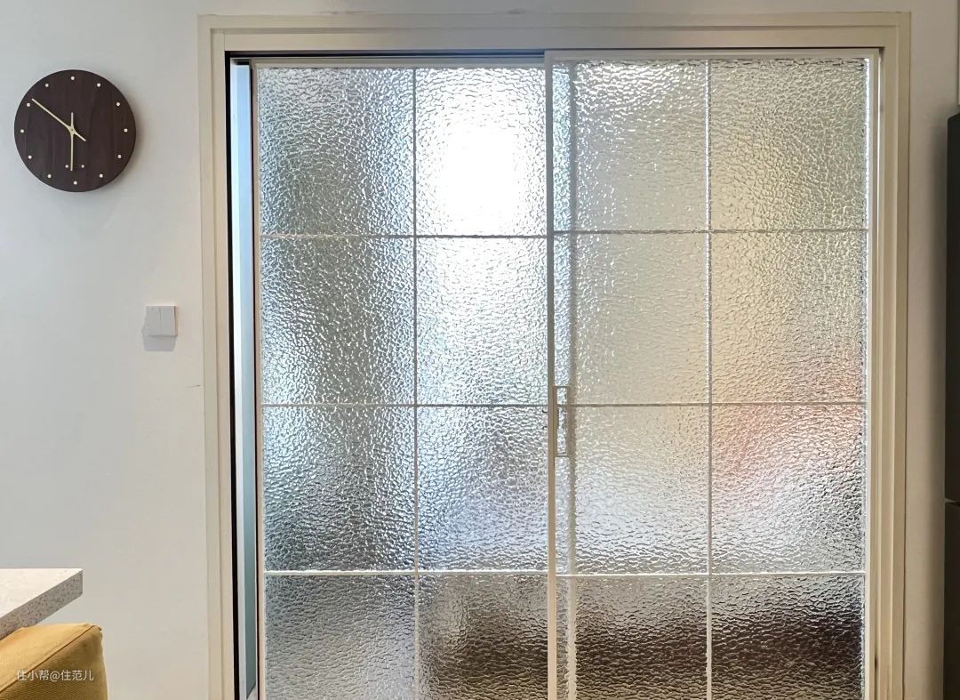 为了避免一进门就“一览无余”,用印花玻璃推拉门隔出一间卧室,既保证了客厅的采光,也保护了隐私。