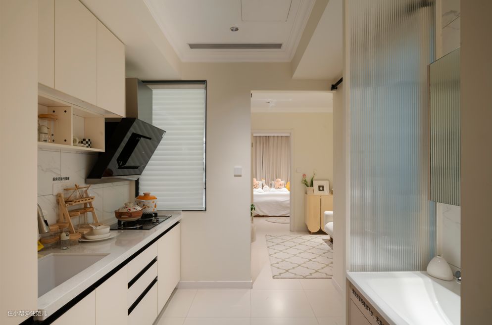 整体颜色是明亮的奶油色,让狭长户型在视觉上更开阔。