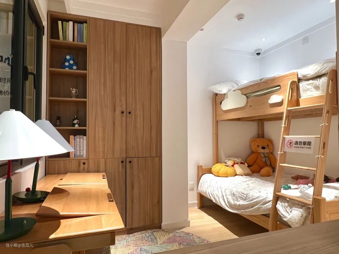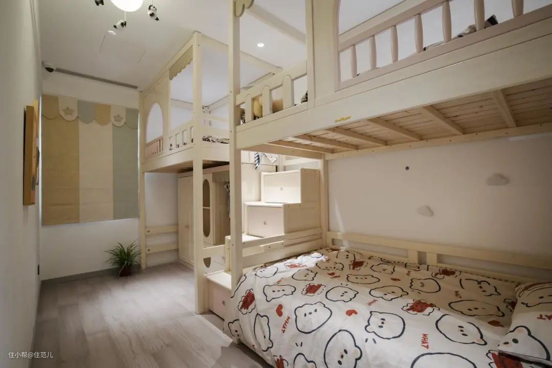 最大的房间留给了小朋友,打造了能容纳三张床和一个小小衣帽间的树屋。