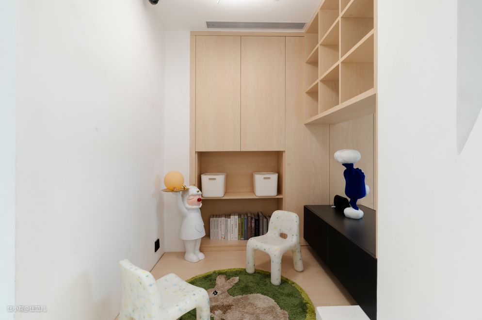 因为还处于备孕阶段,儿童房只定制了简单的树屋,铺上了木地板,满足之后小宝宝爬行玩耍,和少量物品的收纳。