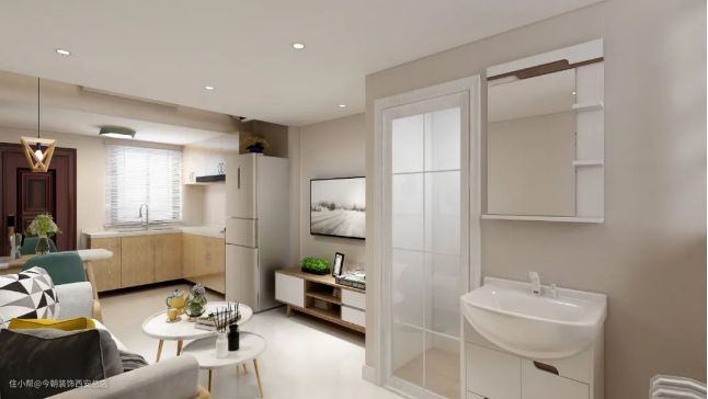 干湿分离中常见的设计方法。优点是能够在「不影响采光」的情况下,还可以隔离空间中的水蒸气,起到干湿分离的作用。