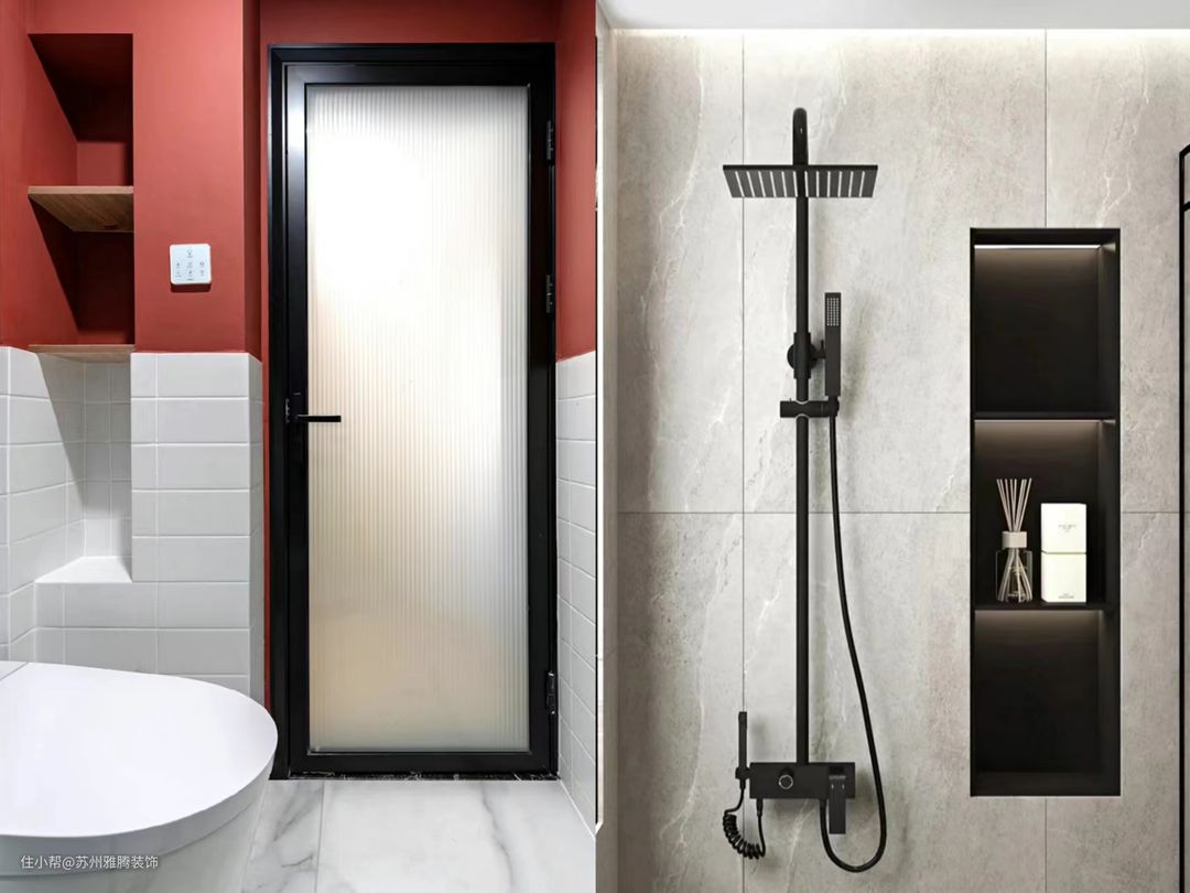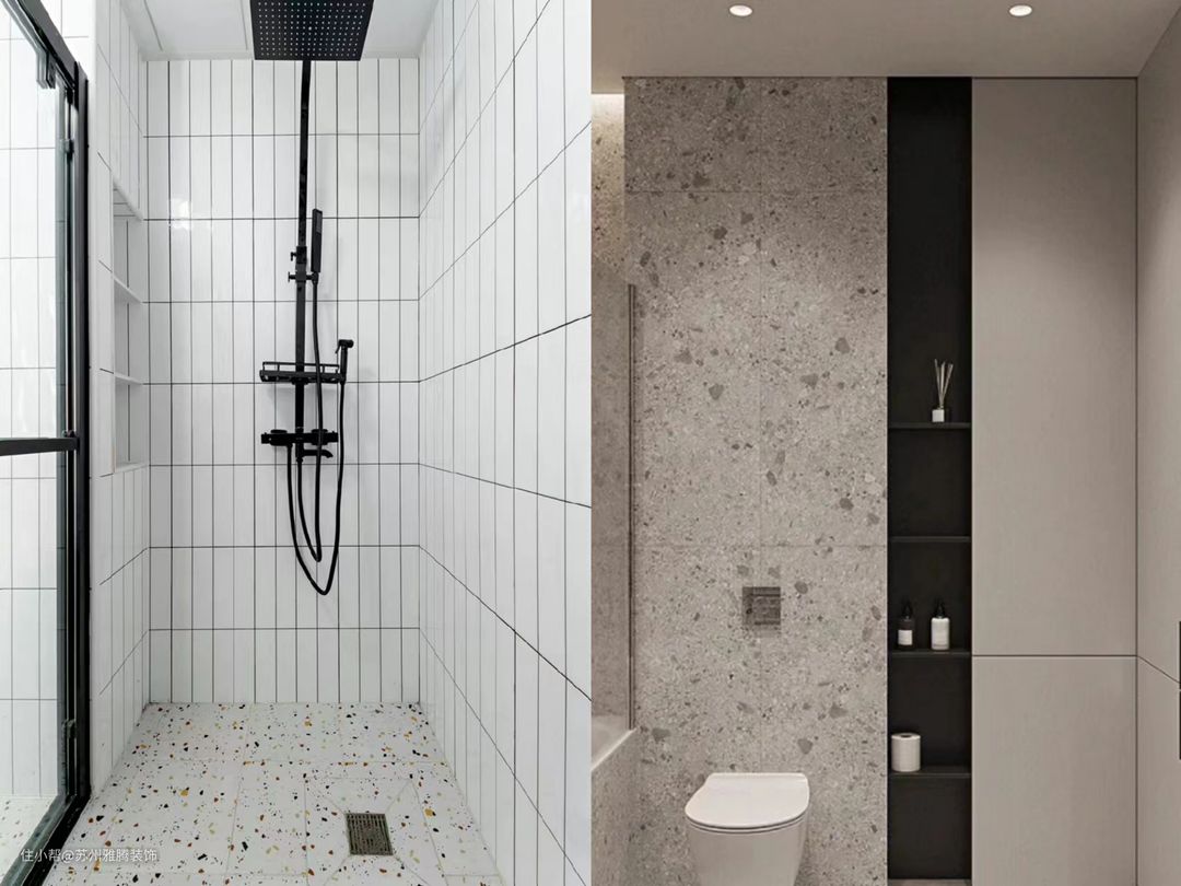 淋浴房利用 L 形的墙体结构,打造3层壁龛,充分满足淋浴区对洗浴用品收纳需求。长条小白砖搭配黑色美缝,提升整体层次,同时还能起到拉伸视觉层高的效果。