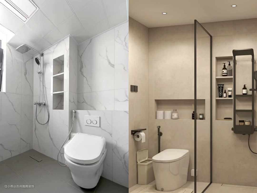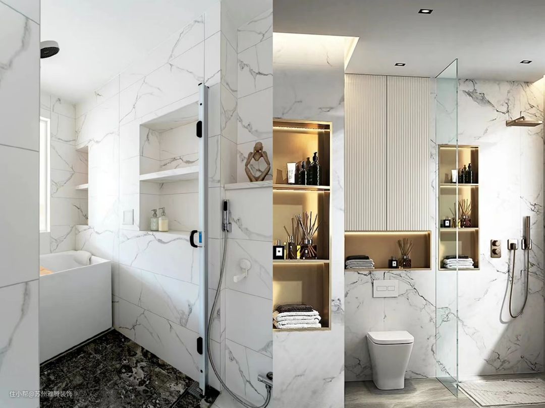 卫生间由于用水频繁,普通的收纳空间容易受水气的侵蚀,时间一久容易老化损坏。利用墙体结构打造壁龛做收纳,可以很好的避免这个问题,与墙体一体,经久耐用易打理。