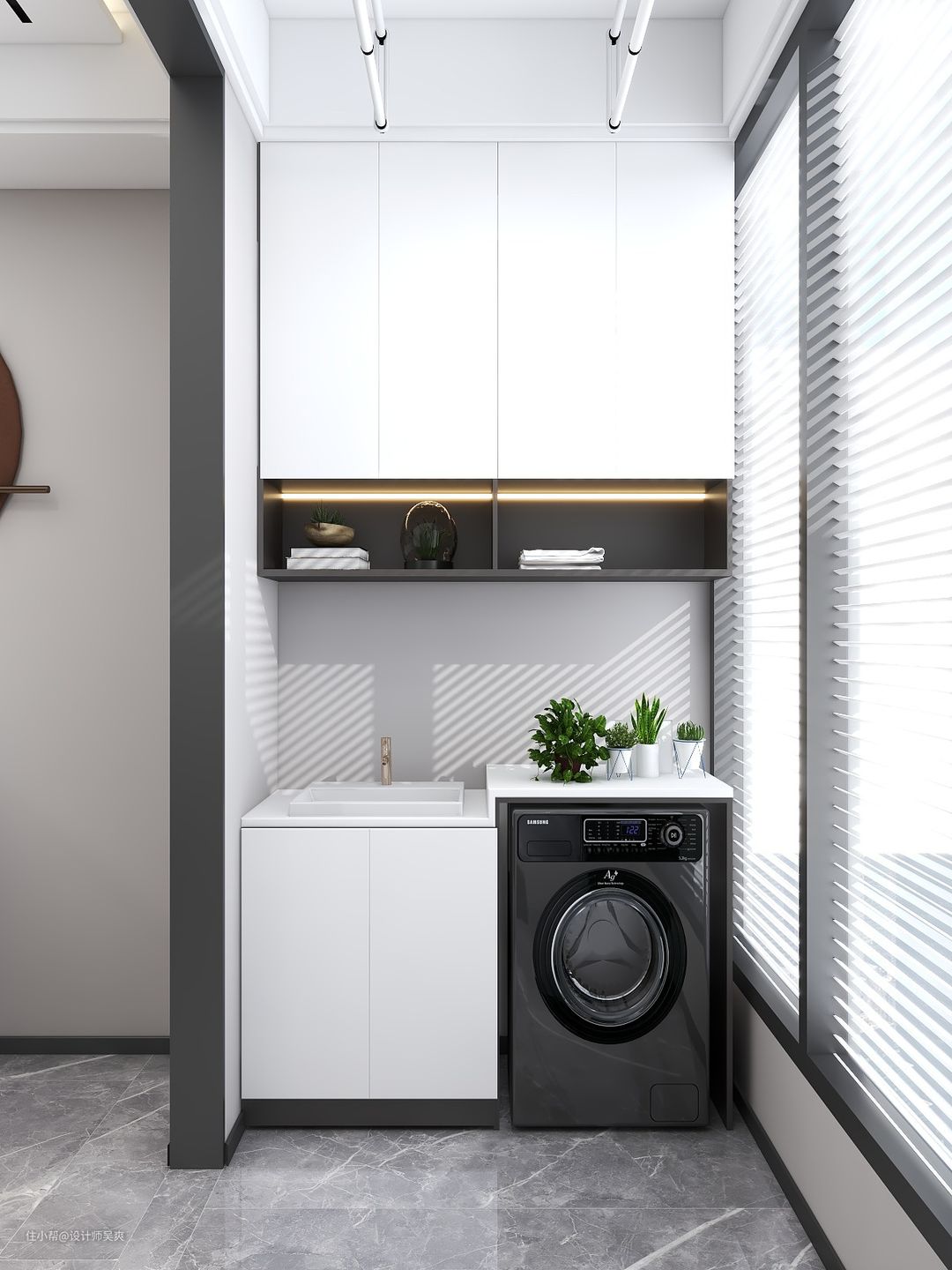 不养宠物,阳台独立做一个洗衣服的空间 有洗衣机 烘干机 晾衣架 贴身衣物收纳柜