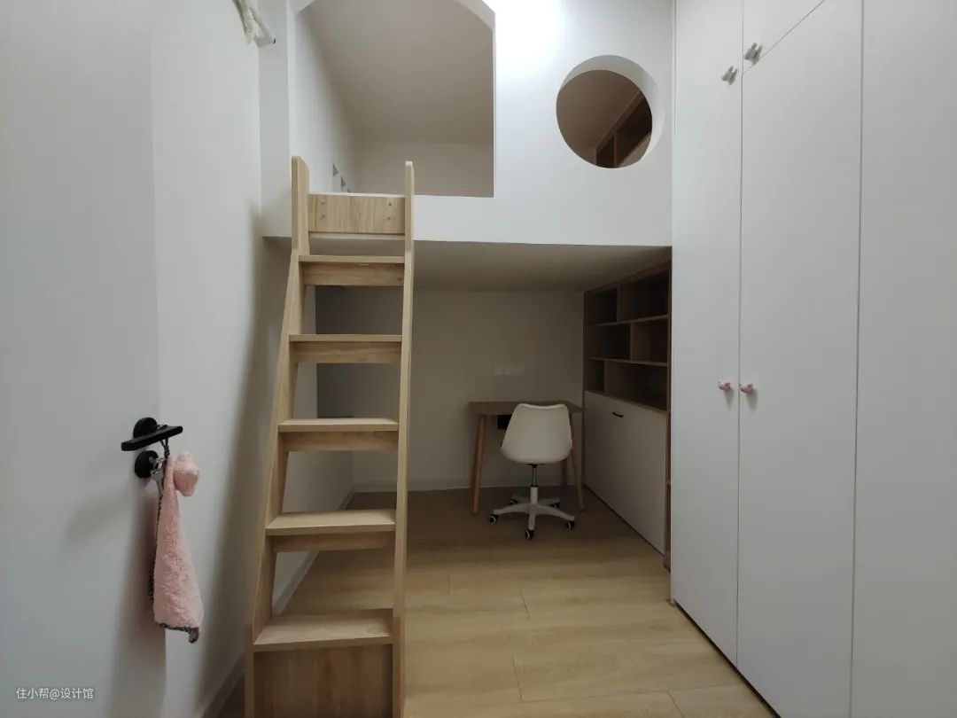 卧室面积太小的时候,就可以想办法利用好立面空间,通过定制高架床的设计,把床铺设在较高的区域,然后床下空间可以装衣柜、摆放书桌等,让小卧室实现更多的功能。