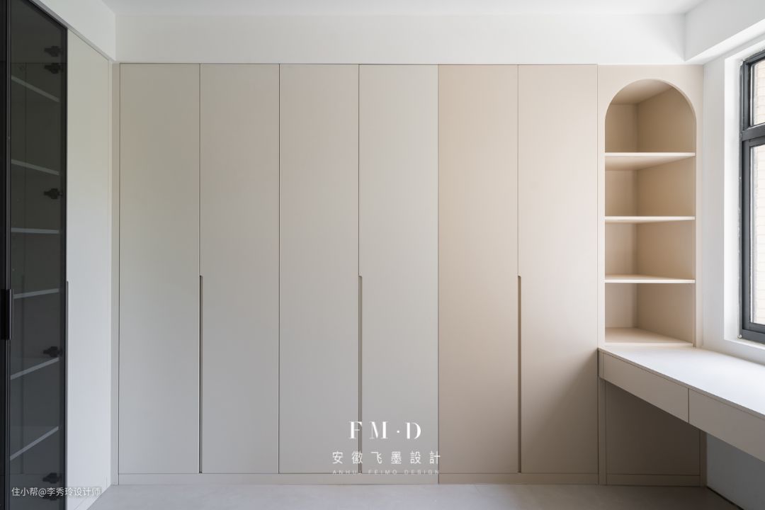 满足业主的多样化储物功能需求,柜体侧面留出卧室的置物台,也可随业主的生活需求进行多种功能变化,比如成为夜晚起夜喝水时的茶水台也是非常不错的选择。直角的地方为了照顾居者的舒适度以及安全性,特地做了圆弧处理,弱化直角的同时也给居者满满的安全感。