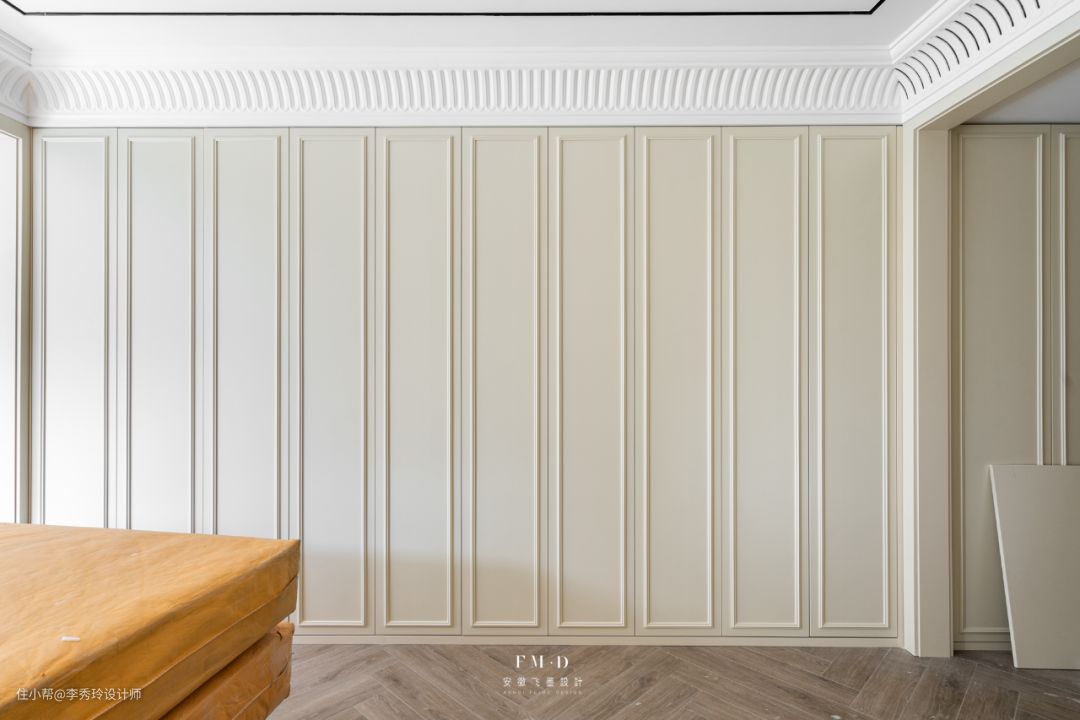 主卧的墙面定制护墙板+木作角花,咖啡知己的淡黄色调营造精致温柔的卧室氛围。