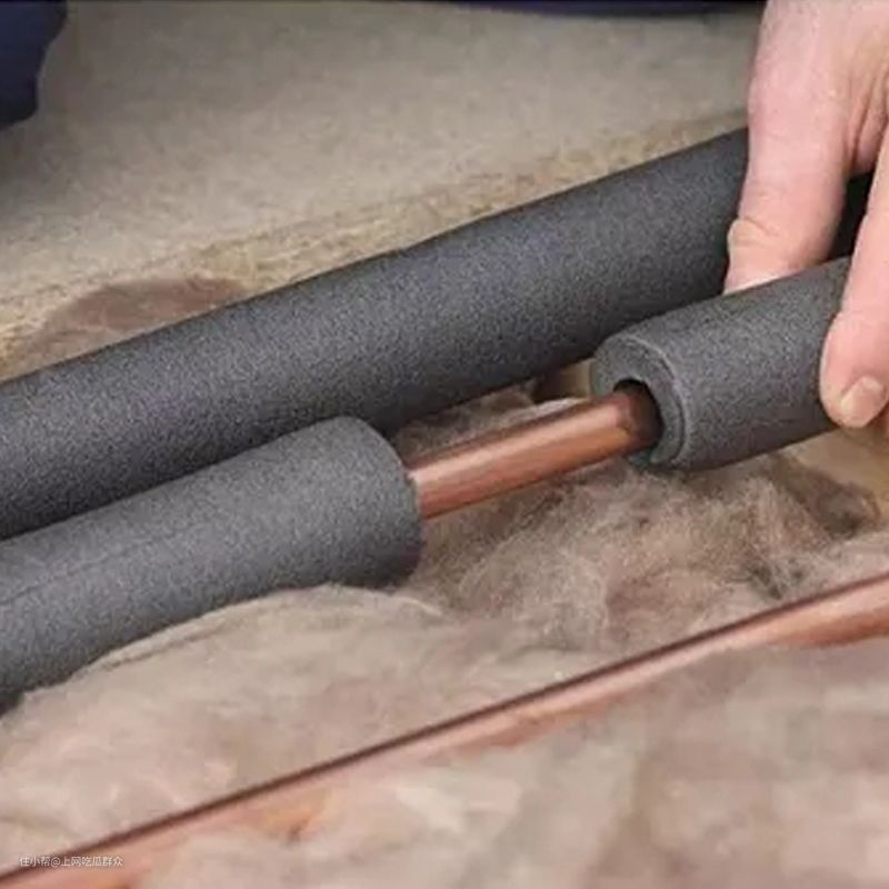 铜管外面的保温棉需要选择厚度在 19 毫米以上的 B1 级难燃等级的橡塑保温棉。我们去现场验收的时候,一定要确保所有的铜管都被保温棉包严实了,尤其是连接处的那个接头,凡是有一点点的漏洞,就很容易造成后期的开裂。这个东西是封在吊顶里面的。里面的低温铜管如果没有包严实,就会不停地产生冷凝水。就像那个冰可乐从冰箱拿出来,表面一会就是冷凝水。那这个铜管露出来的地方会不断地滴水,然后你的吊顶就被泡了,就发霉了。保温棉必须包严实。