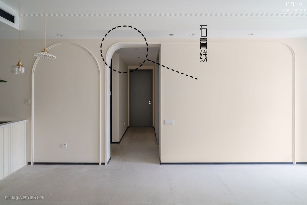 像是家里的过道,不包门套又如何,门洞包成半拱形,沿着边角包圈石膏线,一下子线条感就出来了。刚好也和两侧客厅、餐厅的背景墙相呼应,全屋真的温馨感满满。