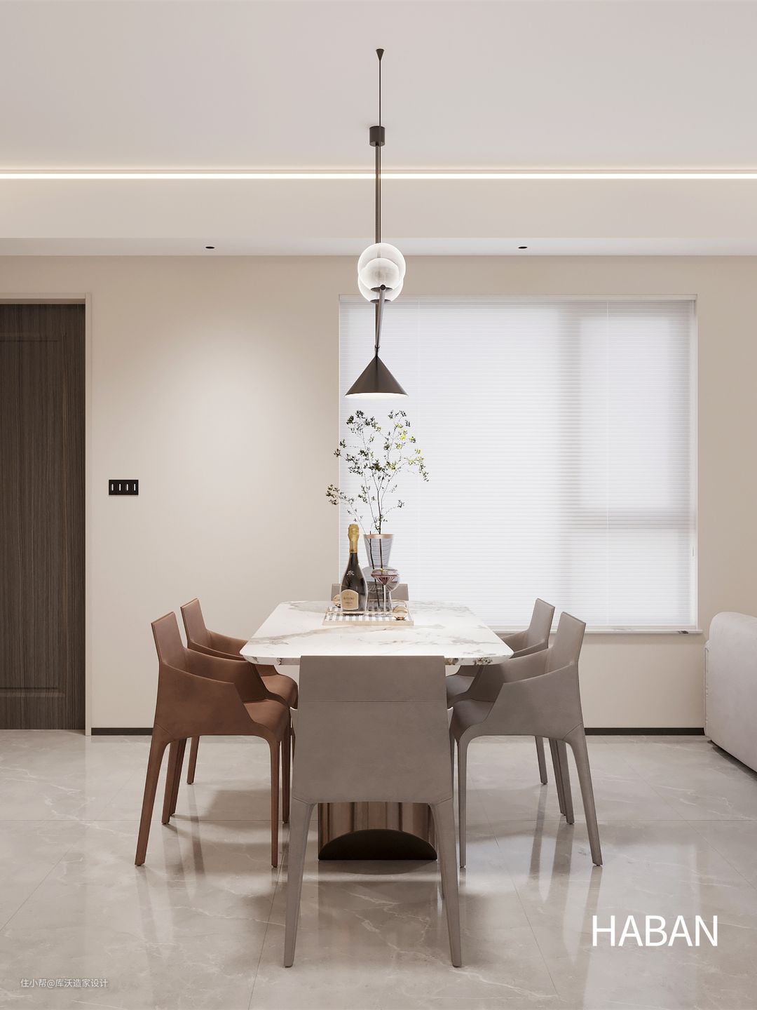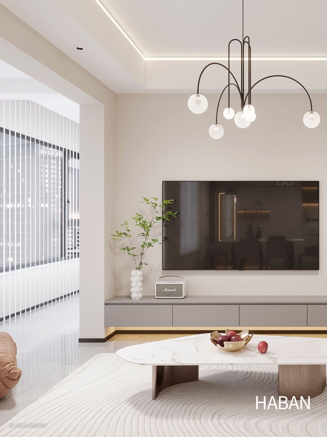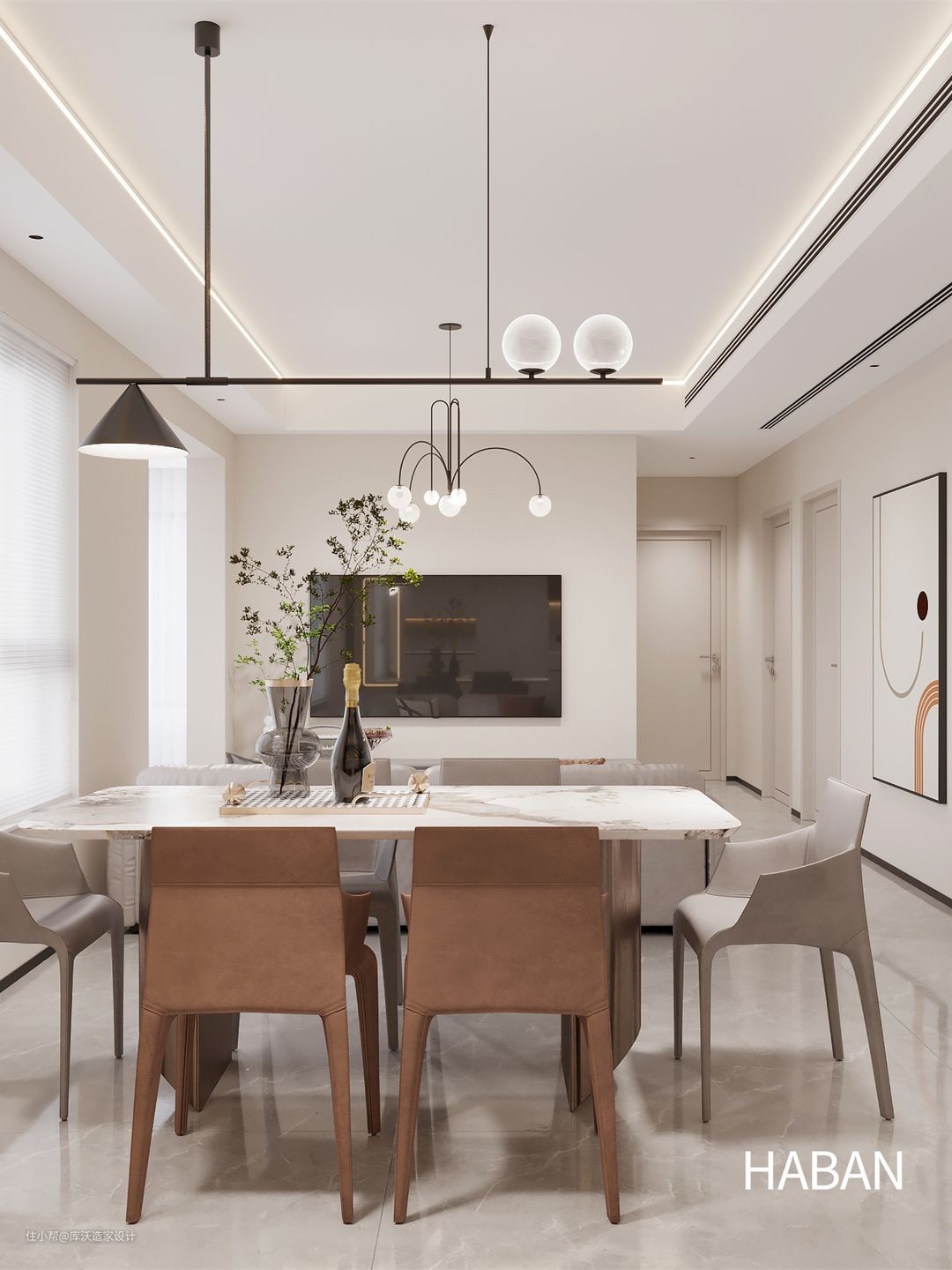 客厅采用简约大方的设计,电视墙大面积留白,除开悬空电视柜外,不做任何造型,只需陶瓷花瓶与绿植的简单装饰也能营造出一副唯美的画面。顶面设计边顶隐藏空调出风口,边顶嵌入氛围灯带,让夜晚更加温馨浪费。