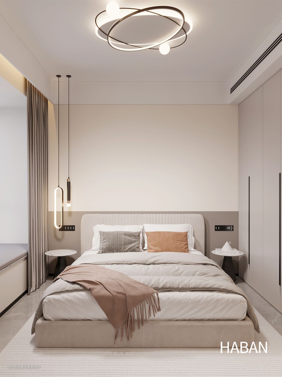 主卧设计单眼皮吊顶,简约时尚美观,床头背景墙采用乳胶漆分色处理,屋主要求全屋铺瓷砖,冬天比较冰冷,我们在客厅与主卧都设计有地毯,即使冬天也能居住的温暖舒适。卫生间分区设计淋浴房、智能马桶、定制浴室柜。