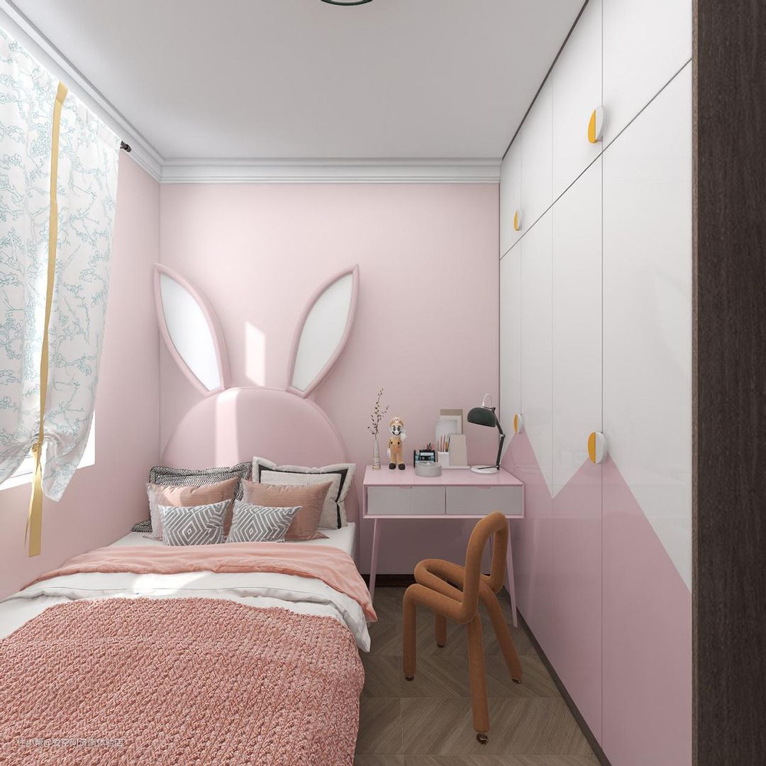 卧室的床,配套的床头柜,衣柜都延续了蔷薇色的梦幻,和谐统一,让整个空间被浪漫环绕,兔子耳朵的床头可爱极了,是孩子喜欢的。孩子稍微长大之后需要有自己独立的空间,有利于建立自我和边界感。