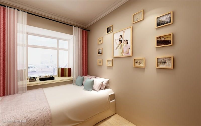 儿童房因空间的问题设计一个榻榻米床,与学习桌连为一体,地面是强化复合地板,墙面是乳胶漆,顶面是石膏线圈边,同时满足了休息和学习的双重功能。