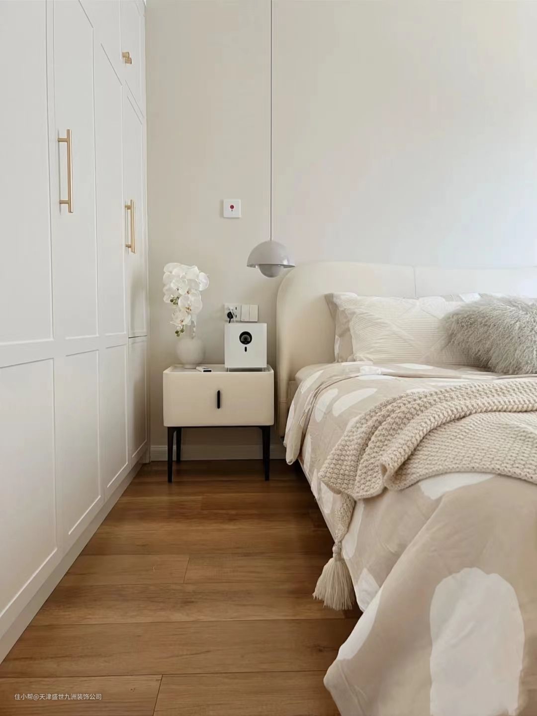 墙面通刷奶油白的乳胶漆,地面铺装原木色地板,再搭配棉麻质感的米杏色床品,让整个房间舒适又不失高级,相比大白墙,格调立马上升一个高度!