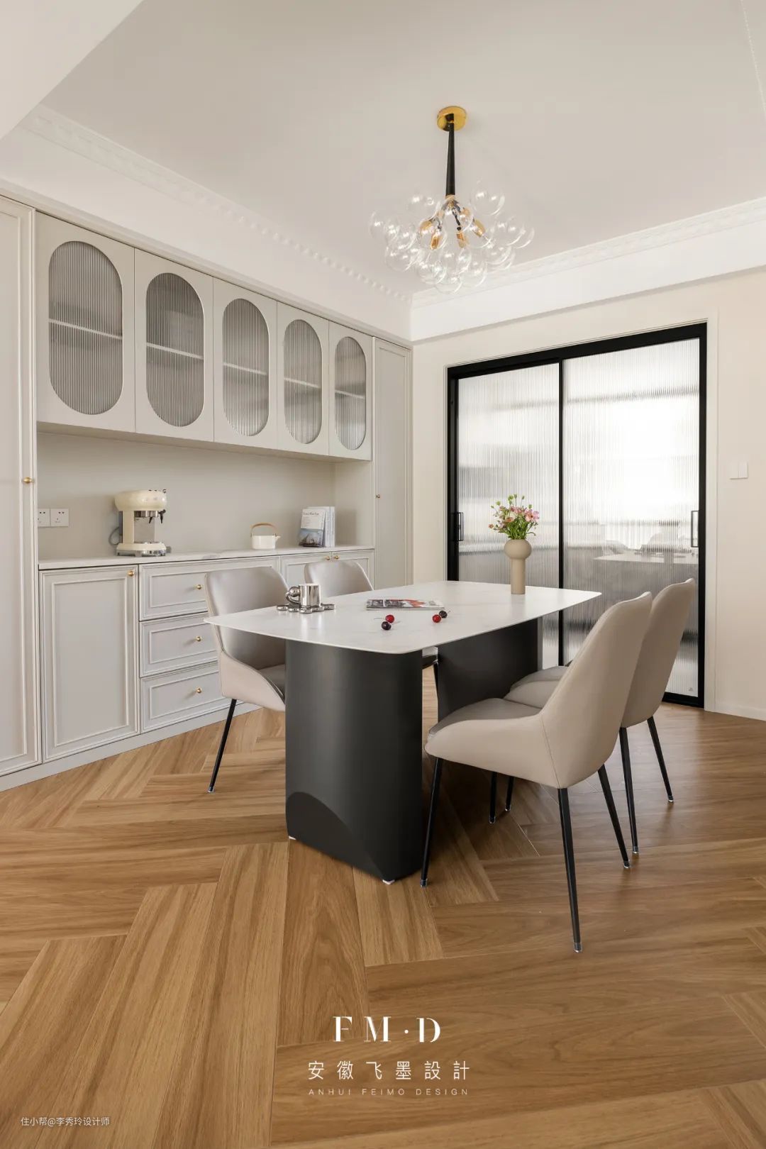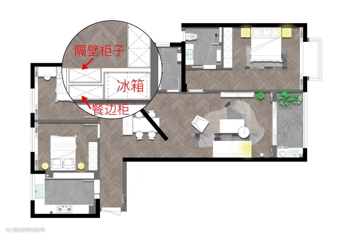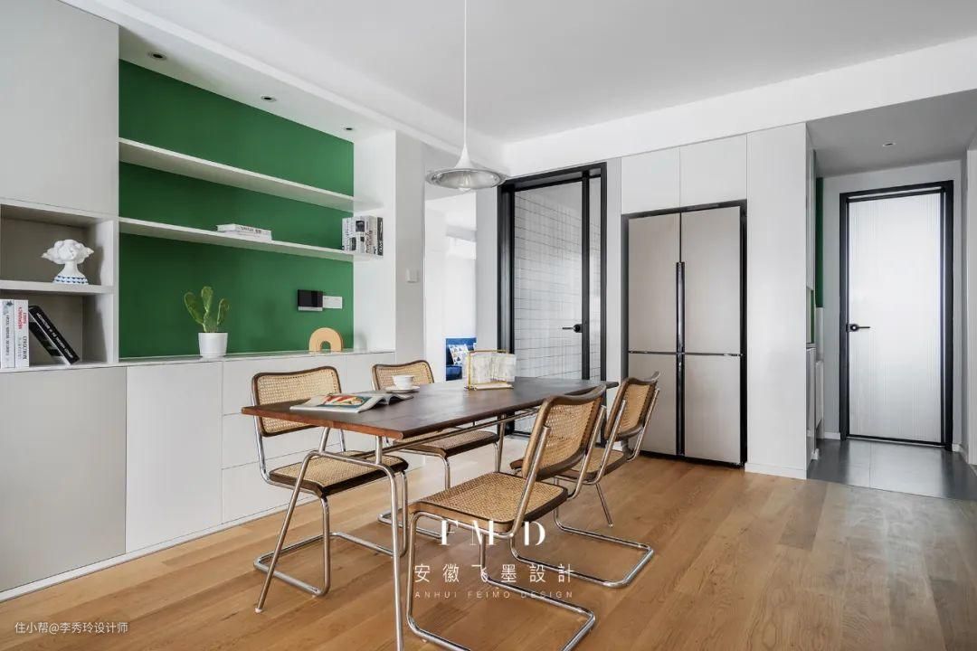 设计攻略:餐厅墙面是非承重墙,可以将墙体砸掉,冰箱嵌入墙体内部保持与餐边柜表面平齐。