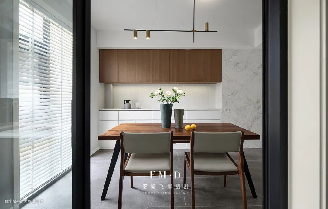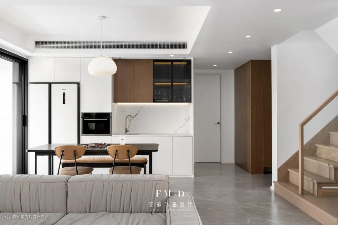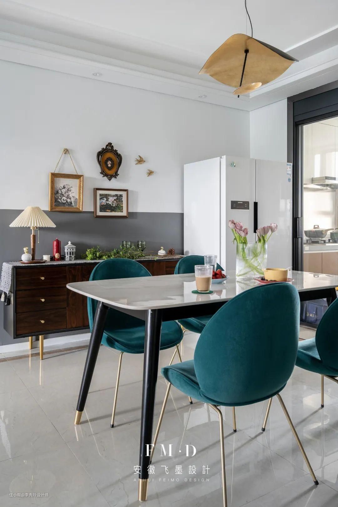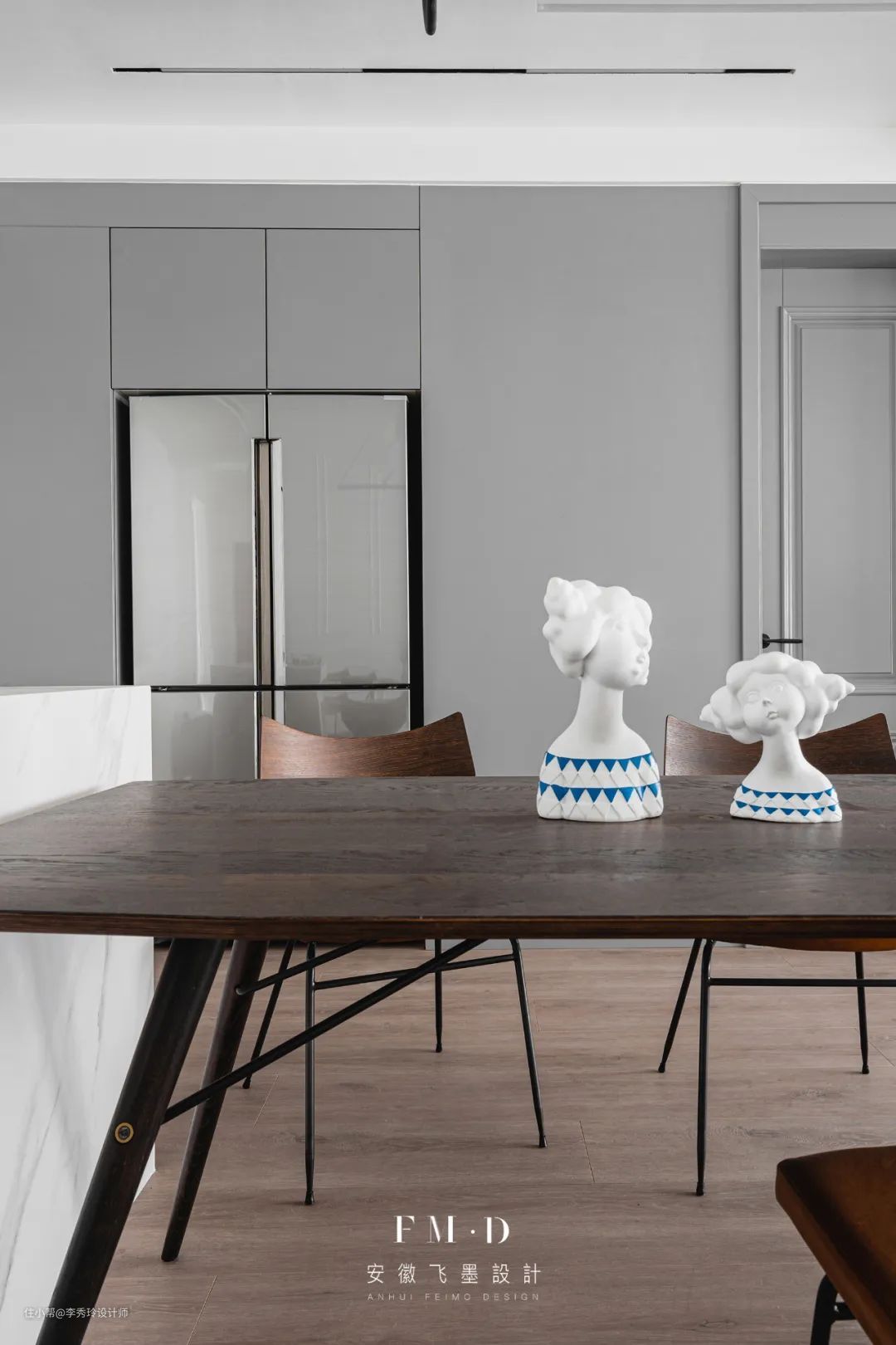 设计攻略:餐厅墙面是非承重墙,可以将墙体砸掉,冰箱嵌入墙体内部保持与餐边柜表面平齐。